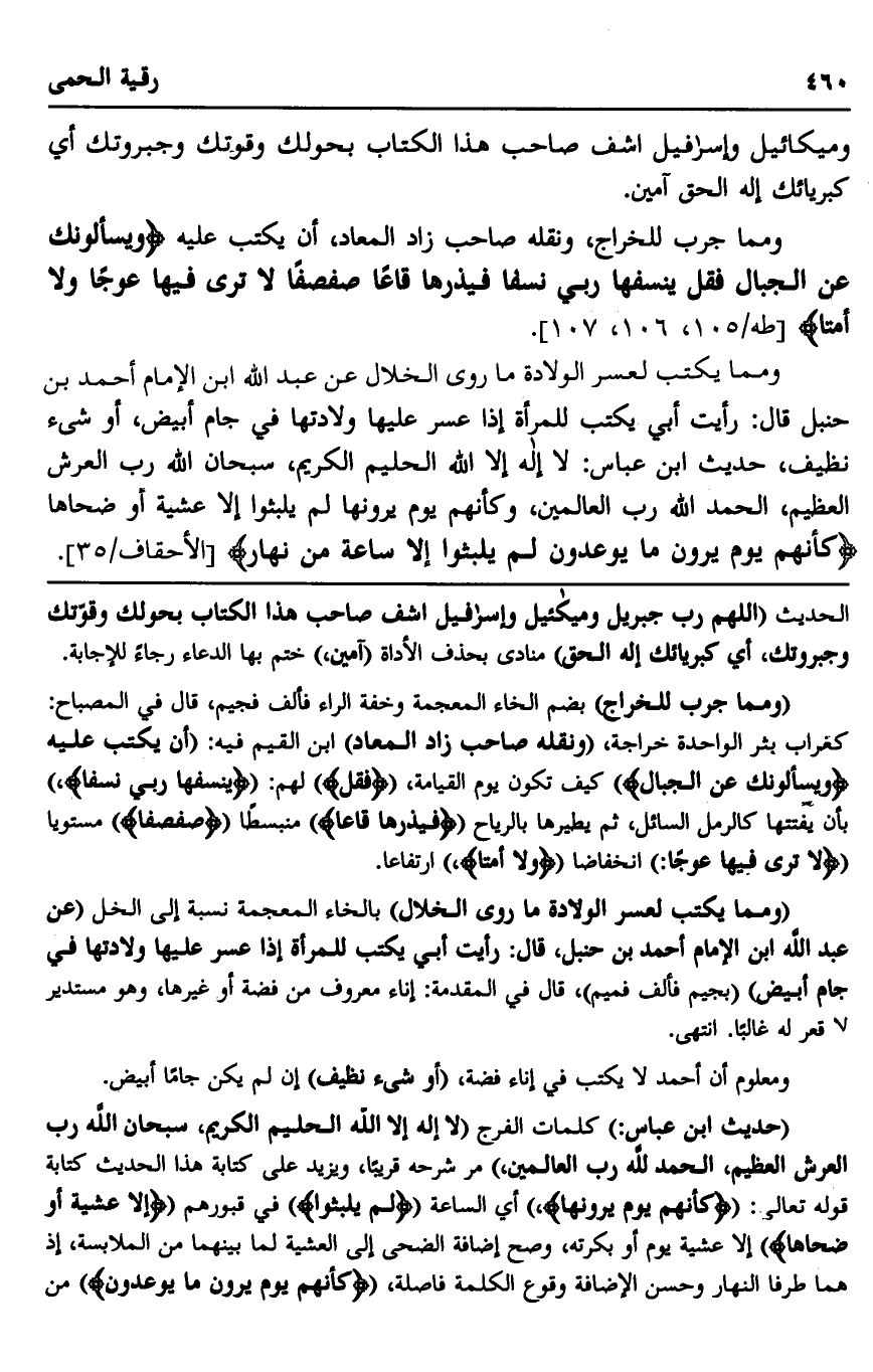ومما يكتب لعسر الولادة ما روى الخلال عن عبد الله ابن الإمام أحمد بن حنبل قال: رأيت أبي يكتب للمرأة إذا عسر عليها ولادتها في جام أبيض، أو شيء نظيف، حديث ابن عباس: لا إله إلا الله الحليم الكريم، سبحان الله رب العرش العظيم، الحمد الله رب العالمين، وكأنهم يوم يرونها لم يلبثوا إلا عشية أو ضحاها {كَأَنَّهُمْ يَوْمَ يَرَوْنَ مَا يُوعَدُونَ لَمْ يَلْبَثُوا إِلاَّ سَاعَةً مِنْ نَهَارٍ} [الأحقاف: 35] .