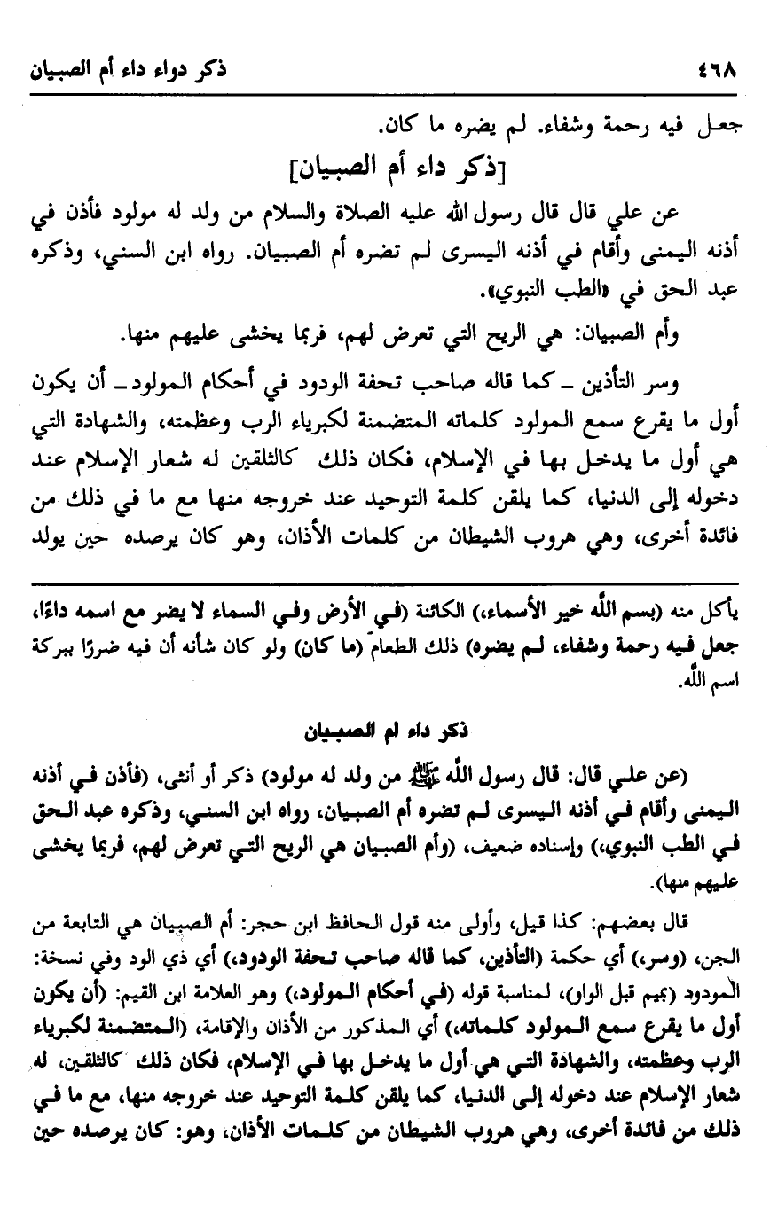 "عن علي قال: قال رسول الله صلى الله عليه وسلم: "من ولد له مولود" ذكر أو أنثى، "فأذن في أذنه اليمنى وأقام في أذنه اليسرى لم تضره أم الصبيان"، رواه ابن السني، وذكره عبد الحق في الطب النبوي" وإسناده ضعيف، "وأم الصبيان هي الريح التي تعرض لهم، فربما يخشى عليهم منها".