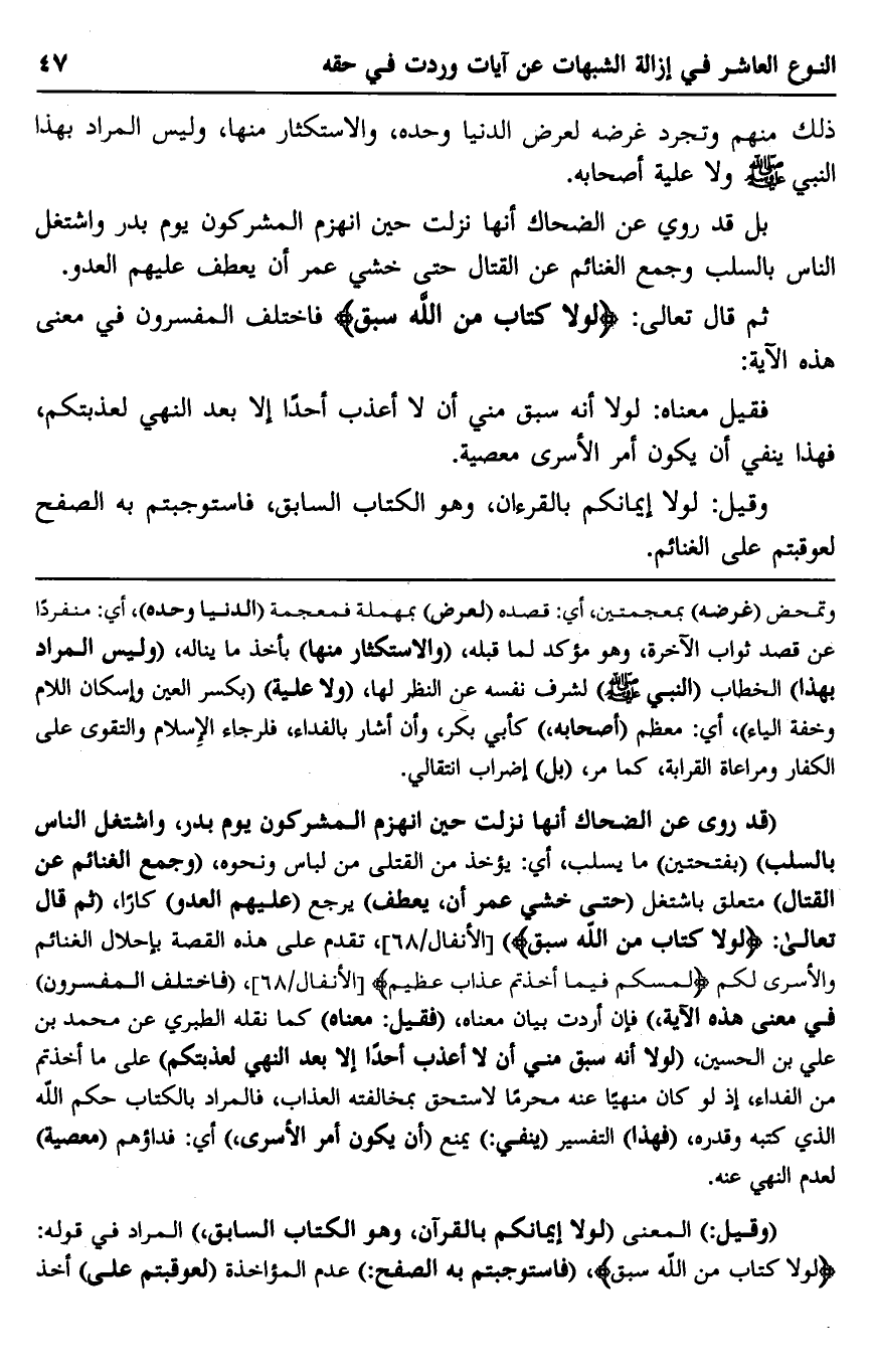 "قد روى عن الضحاك أنها نزلت حين انهزم المشركون يوم بدر، واشتغل الناس بالسلب" "بفتحتين" ما يسلب، أي: يؤخذ من القتلى من لباس ونحوه، "وجمع الغنائم عن القتال" متعلق باشتغل "حتى خشي عمر أن يعطف" يرجع "عليهم العدو" كارًا، "ثم قال تعالى: {لَوْلَا كِتَابٌ مِنَ اللَّهِ سَبَقَ} [الأنفال: 68] ، تقدم على هذه القصة بإحلال الغنائم والاسرى لكم {لَمَسَّكُمْ فِيمَا أَخَذْتُمْ عَذَابٌ عَظِيمٌ} [الأنفال: 68] ، "فاختلف المفسرون" في معنى هذه الأية، فإن أردت بيان معناه "فقيل: معناه" كما نقله الطبري عن محمد بن علي بن الحسين "لولا أنه سبق مني أن لا أعذب أحدًا إلا بعد النهي لعذبتكم" على ما أخذت من الفداء، إذ لو كان منهيًا عنه محرمًا لاستحق بمخالفته العذاب، فامراد بالكتاب حكم الله الذي كتبه وقدهر، "فهذا" التفسير "ينفي": يمنع "أن يكون أمر الأسرى" أي: فداؤهم "معصية لعدم النهي عنه.