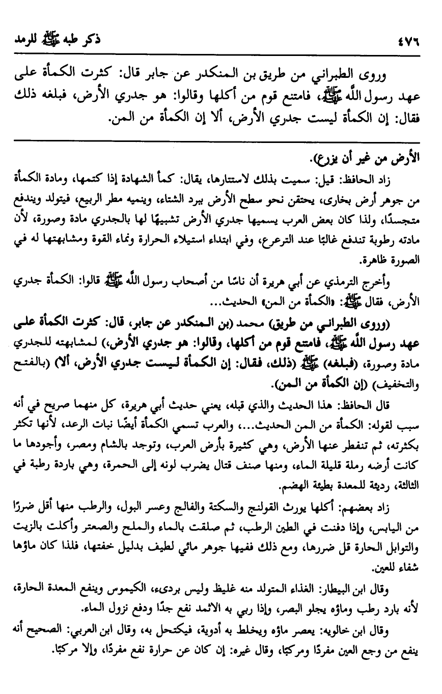 وروى الطبراني من طريق بن المنكدر عن جابر قال: كثرت الكمأة على عهد رسول الله صلى الله عليه وسلم فامتنع قوم من أكلها وقالوا: هو جدري الأرض، فبلغه ذلك فقال: "إن الكمأة ليست جدري الأرض، لا إن الكمأة من المن".