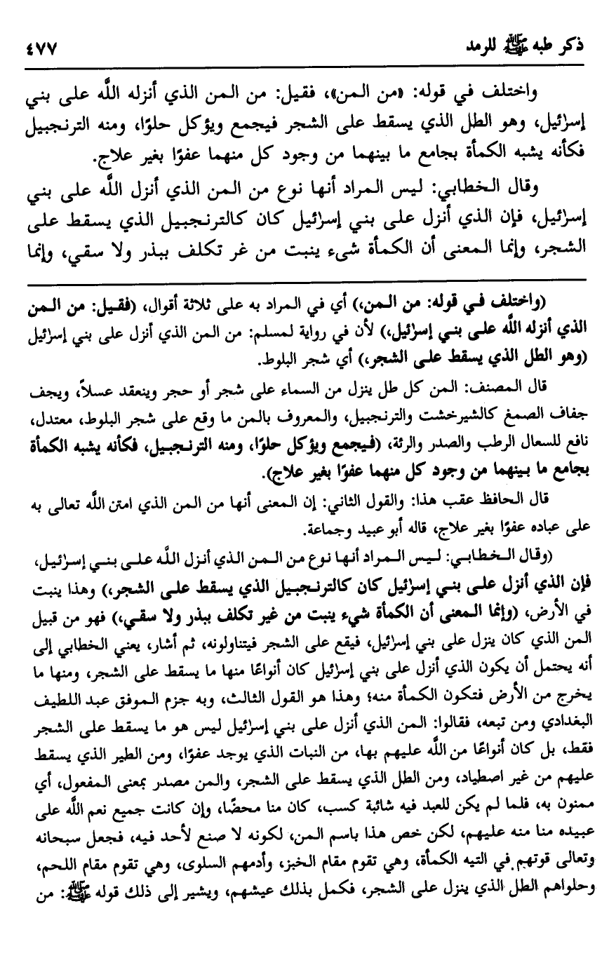 "وقال الخطابي: ليس المراد أنها نوع من المن الذي أنزل الله على بني إسرائيل، فإن الذي أنزل على بني إسرائيل كان كالترنجيل الذي يسقط على الشجر" وهذا ينبت في الأرض، "وإنما المعنى أن الكمأة شيء ينبت من غير تكلف ببذر ولا سقي" فهو من قبيل المن الذي كان ينزل على بني إسرائيل، فيقع على الشجر فيتناولونه، ثم أار، يعني الخطابي إلى أنه يحتمل أن يكون الذي أنزل على بني إسرائيل، كان أنواعًا منها ما يسقط على الشجر، ومنها ما يخرج من الأرض فتكون الكمأة منه؛ وهذا هو القول الثالث، وبه جزم الموفق عبد اللطيف البغدادي ومن تبعه، فقالوا: المن الذي أنزل على بني إسرائيل ليس هو ما يسقط على الشجر فقط، بل كان أنواعًا من الله عليهم بها، من النبات الذي يوجد عفوًا، ومن الطير الذي يسقط عليهم من غير اصطياد، ومن الطل الذي يسقط على الشجر، والمن مصدر بمعنى المفعول، أي ممنون به، فلما لم يكن للعبد فيه شائبة كسب، كان منا محضًا، وإن كانت جميع نعم الله على عبيده منها منه عليهم، لكن خص هذا باسم المن، لكونه لا صنع لأحد فيه، فجعل سبحانه وتعالى قوتهم في التيه الكمأة، وهي تقوم مقام الخبز، وأدمهم السلوى، وهي تقوم مقام اللحم، وحلواهم الطل الذي ينزل على الشجر، فكمل بذلك عيشهم، ويشير إلى ذلك قوله صلى الله عليه وسلم: "من