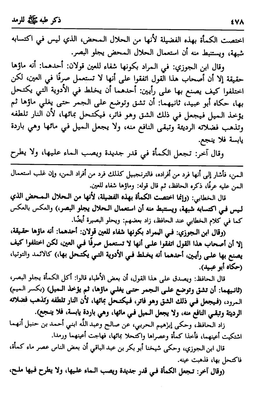 زاد الحافظ، وحكى إبراهيم الحربي، عن صالح وعبد الله ابني أحمد بن حنبل أنهما اشتكيت أعينهما، فأخذا كمأة وعصراها واكتحلا بمائها، فهاجت أعينهما ورمدا.