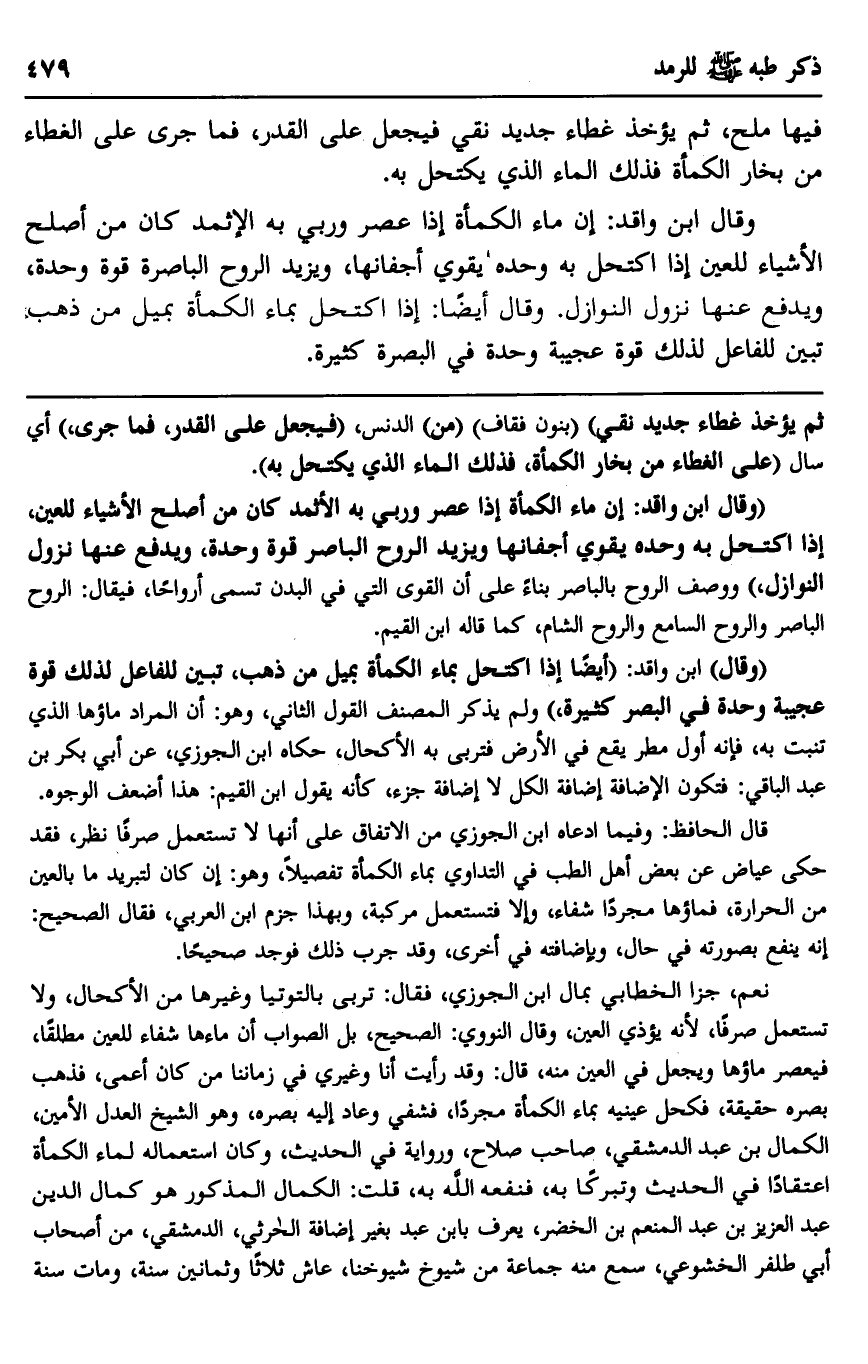 "وقال ابن واقد: إن ماء الكمأة إذا عصر وربي به الأثمد كان من أصلح الأشياء للعين، إذا اكتحل به وحده يقوي أجفانها ويزيد الروح الباصر قوة وحدة، ويدفع عنها نزول النوازل" ووصف الروح بالباصر بناء على أن القوى التي في البدن تسمى أرواحًا، فيقال: الروح الباصر والروح السامع والروح الشام، كما قاله ابن القيم.