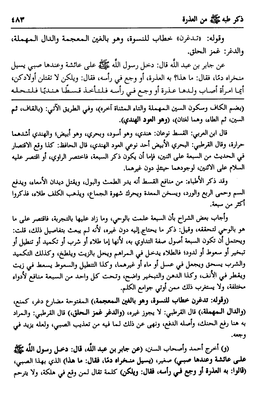 عن جابر بن عبد الله قال: دخل رسول الله صلى الله عليه وسلم على عائشة وعندها صبي يسيل منخراه، دمًا، فقال: "ما هذا؟ به العذرة، أو وجع في رأسه"، فقال: "ويلكن لا تقتلن أولادكن، أيما امرأة أصاب ولدها عذرة أو وجع في رأسه فلتأخذ قسطًا هنديًا فلتحله