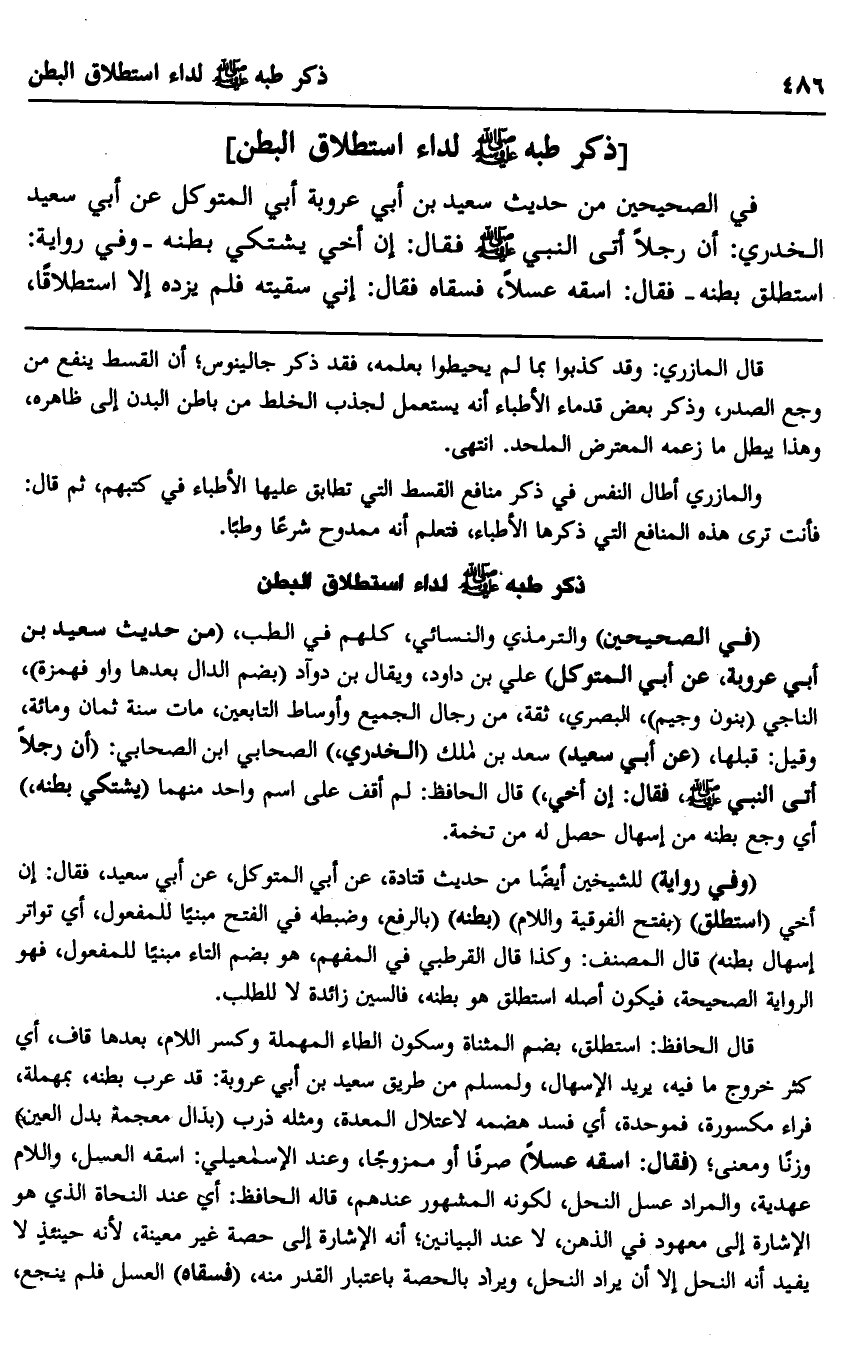 في الصحيحين من حديث سعيد بن أبي عروبة أبي المتوكل عن أبي سعيد الخدري: أن رجلًا أتى النبي صلى الله عليه وسلم فقال: إن أخي يشتكي بطنه -وفي رواية استطلق بطنه- فقال: "اسقه عسلًا"، فسقاه فقال: إني سقيته فلم يزده إلا استطلاقًا،
