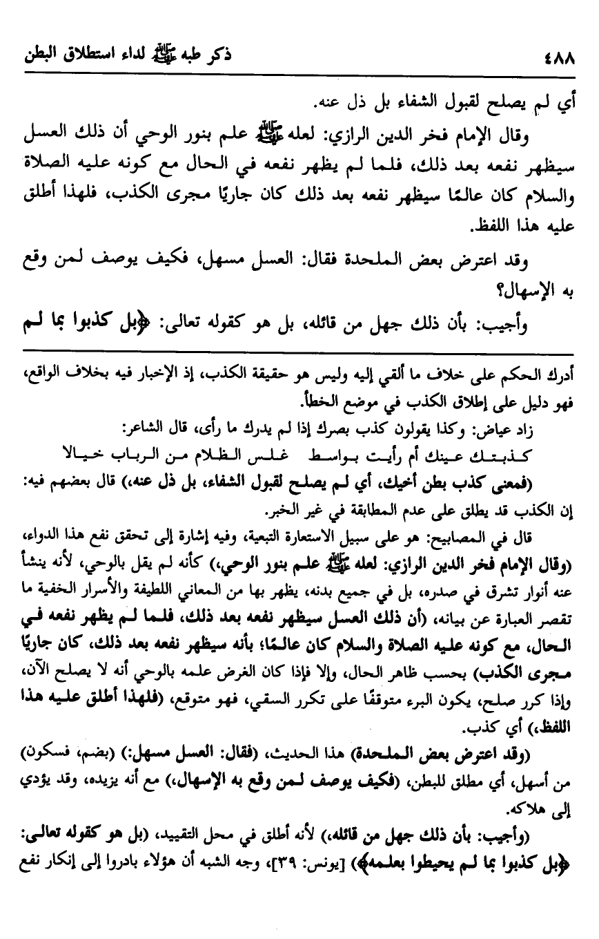 قال في المصابيح: هو على سبيل الاستعارة التبعية، وفيه إشارة إلى تحقيق نفع هذا الدواء، "وقال الإمام فخر الدين الرازي: لعله صلى الله عليه وسلم علم بنور الوحي" كأنه لم يقل بالوحي؛ لأنه ينشأ عنه أنوار تشرق في صدره، بل في جميع بدنه، يظهر بها من المعاني اللطيفة والأسرار الخفية ما تقصر العبارة عن بيانه، "أن ذلك العسل سيظهر نفعه بعد ذلك، فلما لم يظهر نفعه في الحال، مع كونه عليه الصلاة والسلام كان عالمًا؛ بأنه سيظهر نفعه بعد ذلك، كان جاريًا مجرى الكذب" بحسب ظاهر الحال، وإلا فإذا كان الغرض علمه بالوحي أنه لا يصلح الآن، وإذا كرر صلح، يكون البرء متوقفًا على تكرر السقي، فهو متوقع، "فلهذا أطلق عليه هذا اللفظ" اي كذب.