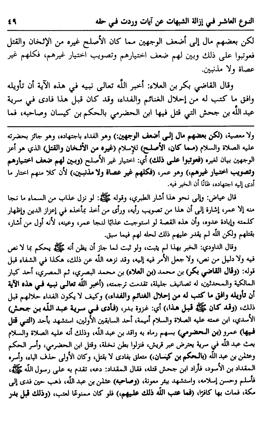 وقال القاضي بكر بن العلاء: أخبر الله تعالى نبيه في هذه الآية أن تأويله وافق ما كتب له من إحلال الغنائم والفداء، وقد كان قبل هذا فادي في سرية عبد الله بن جحش التي قتل فيها ابن الحضرمي بالحكم بن كيسان وصاحبه، فما