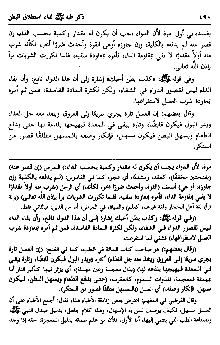 وقال القرطبي في المفهم: اعترض بعض زنادقة الأطباء هذا، فقال: أجمع الأطباء على أن العسل مسهل، فكيف يوصف لمن به الإسهال، وهذا كلام جاهل، بدليل صدق النبي صلى الله عليه وسلم، وبصناعة الطب التي ينتمي إليها، أما الأول، فلأن من علم صدقه بدليل المعجزة، حقه إذا وجد