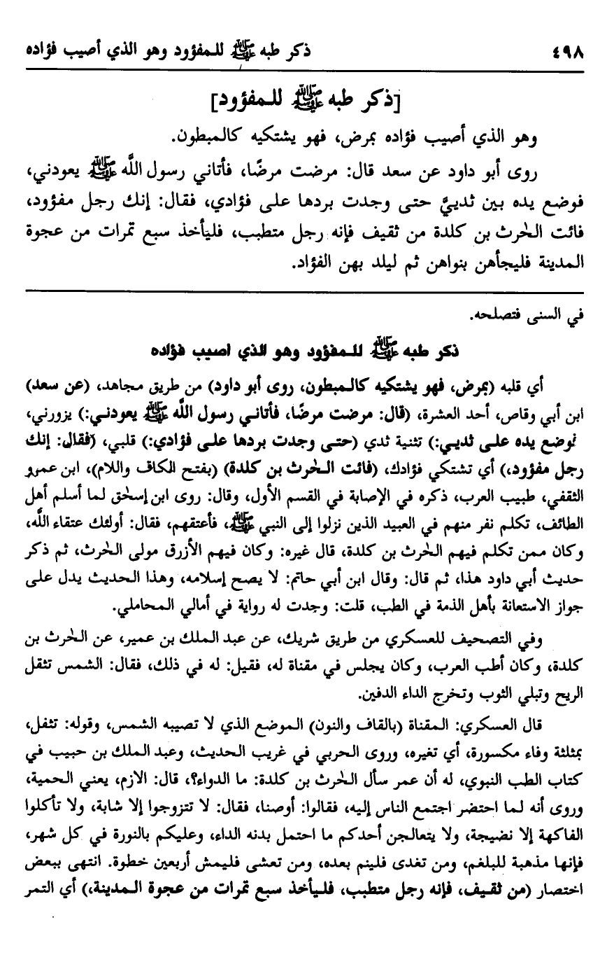 روى أبو داود عن سعد قال: مرضت مرضًا، فأتاني رسول الله صلى الله عليه وسلم يعودني، فوضع يده بين ثديي حتى وجدت بردها على فؤادي، فقال: "إنك رجل مفؤود، فائت الحارث بن كلدة من ثقيف فإنه رجل متطبب، فليأخذ سبع تمرات من عجوة المدينة فليجأهن بنواهن ثم ليلد بهن الفؤاد".