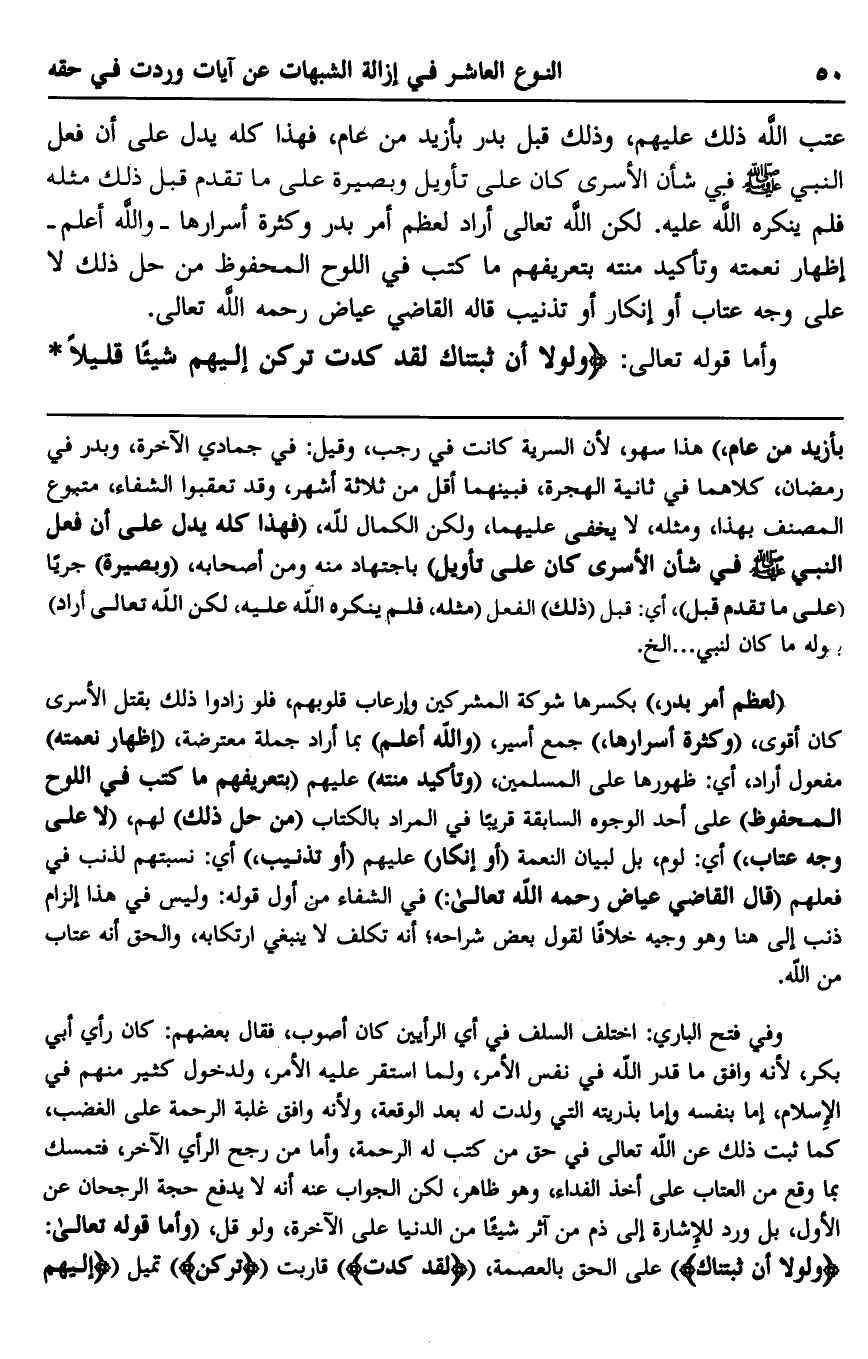 وفي فتح الباري: اختلف السلف في أي الرأيين كان أصوب، فقال بعضهم: كان رأي أبي بكر، لأنه وافق ما قدر الله في نفس الأمر، ولما استقر عليه الأمر، ولدخول كثير منهم في الإسلام، إما بنفسه وإما بذريته التي ولدت له بعد الوقعة، ولأنه وافق غلبة الرحمة على الغضب، كما ثبت ذلك عن الله تعالى في حق من كتب له الرحمة، وأما من رجح الرأي الآخر، فتمسك بما وقع من العتاب على أخذ الفداء، وهو ظاهر، لكن الجواب عنه أنه لا يدفع حجة الرجحان عن الأول، بل ورد للغشارة إلى ذم من آثر شيئًا من الدنيا على الآخرة، ولو قل: "وأما قوله تعالى: {وَلَوْلَا أَنْ ثَبَّتْنَاكَ} على الحق بالعصمة، {لَقَدْ كِدْتَ} قاربت {تَرْكَنُ} تميل {إِلَيْهِمْ