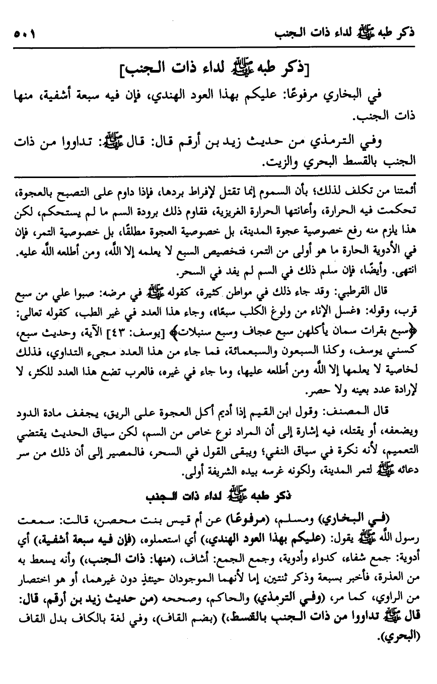 "في البخاري" ومسلم، مرفوعًا" عن أم قيس بنت محصن، قالت: سمعت رسول الله صلى الله عليه وسلم يقول: "عليكم بهذا العود الهندي" أي استعملوه، "فإن فيه سبعة أشفية" أي أدوية: جمع شفاء، كدواء وأدوية، وجمع الجمع: أشاف، "منها: ذات الجنب" وأنه يسعط به من العذرة، فأخبر بسبعة وذكر ثنتين، إما لأنهما الموجودان حينئذ دون غيرهما، أو هو اختصار من الراوي، كما مر، "وفي الترمذي" والحاكم، وصححه "من حديث زيد بن أرقم، قال: قال صلى الله عليه وسلم: "تداووا من ذات الجنب بالقسط" "بضم القاف" وفي لغة بالكاف بدل القاف "البحري".