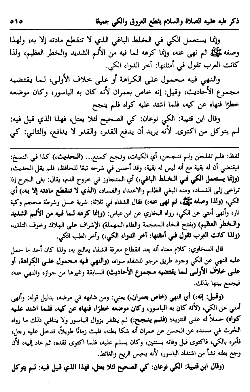 وإنما يستعمل الكي في الخلط الباغي الذي لا تنقطع مادته إلا به، ولهذا وصفه صلى الله عليه وسلم ثم نهى عنه، وإنما كرهه لما فيه من الألم الشديد والخطر العظيم، ولذا كانت العرب تقول في أمثلتها: آخر الدواء الكي.