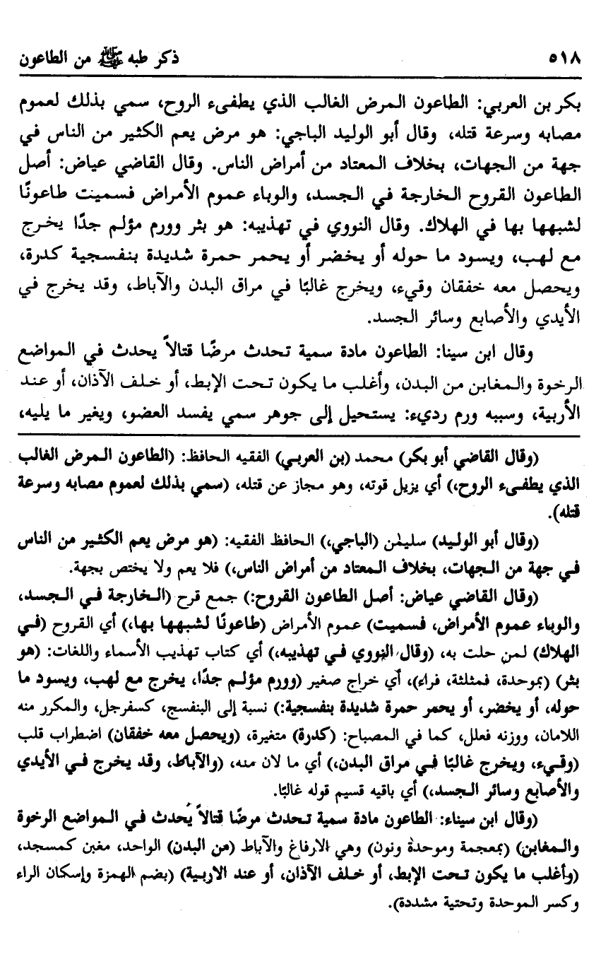 بكر بن العربي: الطاعون المرض الغالب الذي يطفئ الروح، سمي بذلك لعموم مصابه وسرعة قتله، وقال أبو الوليد الباجي: هو مرض يعم الكثير من الناس في جهة من الجهات، بخلاف المعتاد من أمراض الناس. وقال القاضي عياض: أصل الطاعون القروح الخارجة في الجسد، والوباء عموم الأمراض فسميت طاعونًا لشبهها بها في الهلاك. وقال النووي في تهذيبه: هو بئر وورم مؤلم جدًّا يخرج مع لهب، ويسود ما حوله أو يخضر أو يحمر حمرة شديدة بنفسجية كدرة، ويحصل معه خفقان وقيء، ويخرج غالبًا في مراق البدن والآباط، وقد يخرج في الأيدي والأصابع وسائر الجسد.