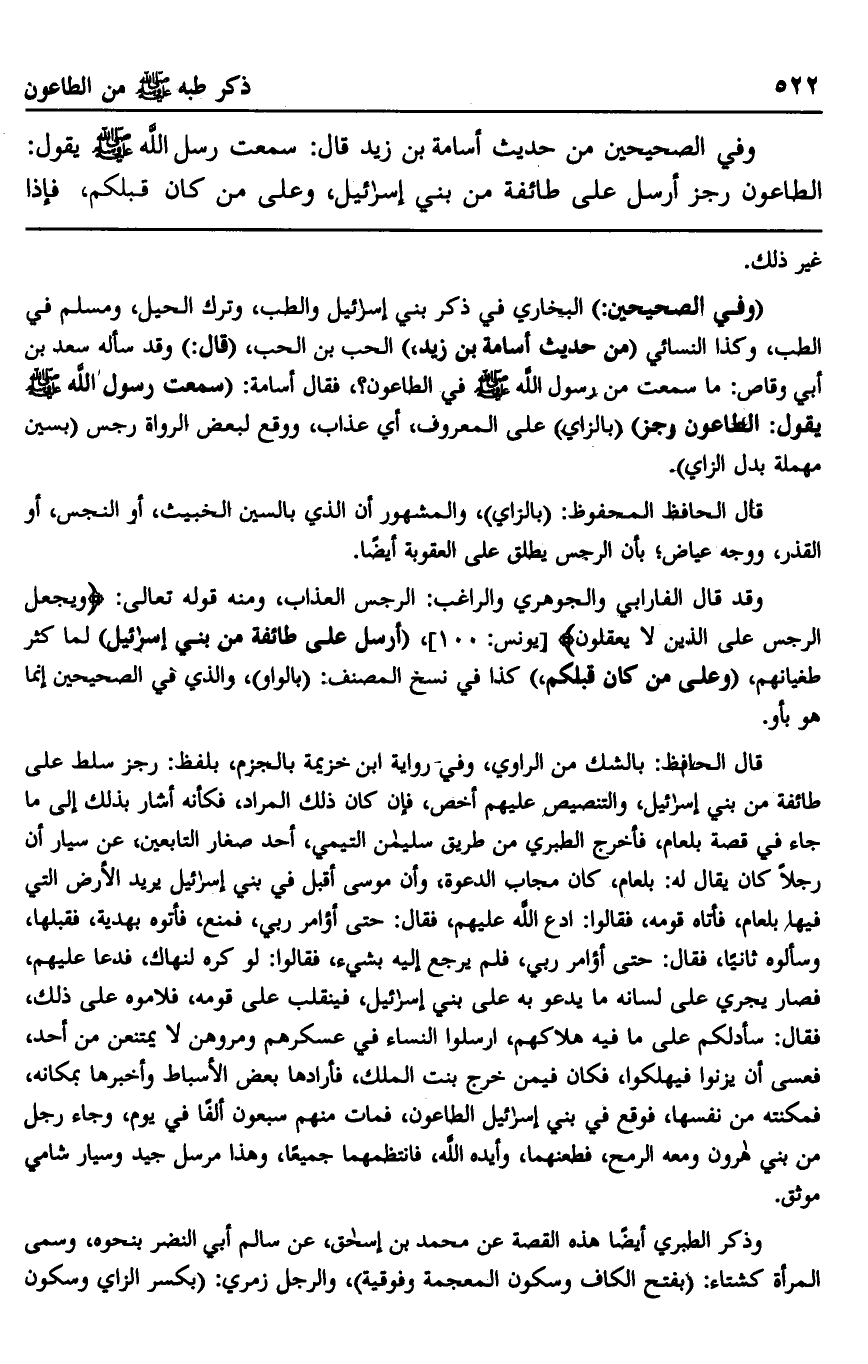 وفي الصحيحين من حديث أسامة بن زيد قال: سمعت رسول الله صلى الله عليه وسلم يقول: "الطاعون رجز أرسل على طائفة من بني إسرائيل، وعلى من كان قبلكم، فإذا