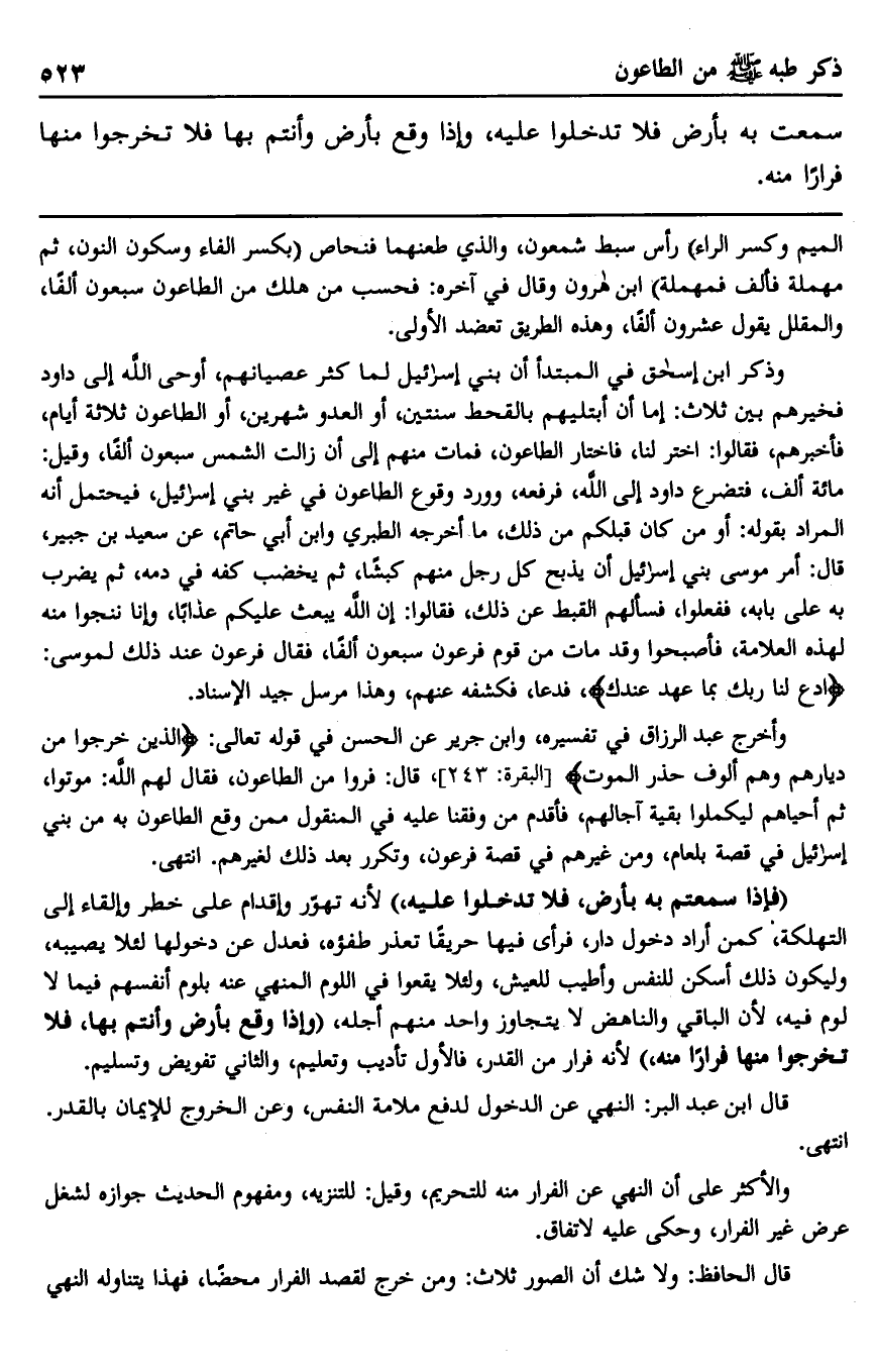 وأخرج عبد الرزاق في تفسيره، وابن جرير عن الحسن في قوله تعالى: {الَّذِينَ خَرَجُوا مِنْ دِيَارِهِمْ وَهُمْ أُلُوفٌ حَذَرَ الْمَوْتِ} [البقرة: 243] ، قال: فروا من الطاعون، فقال لهم الله: موتوا، ثم أحياهم ليكملوا بقية آجالهم، فأقدم من وفقنا عليه في المنقول ممن وقع الطاعون به من بني إسرائيل في قصة بلعام، ومن غيرهم في قصة فرعون، وتكرر بعد ذلك لغيرهم. انتهى.