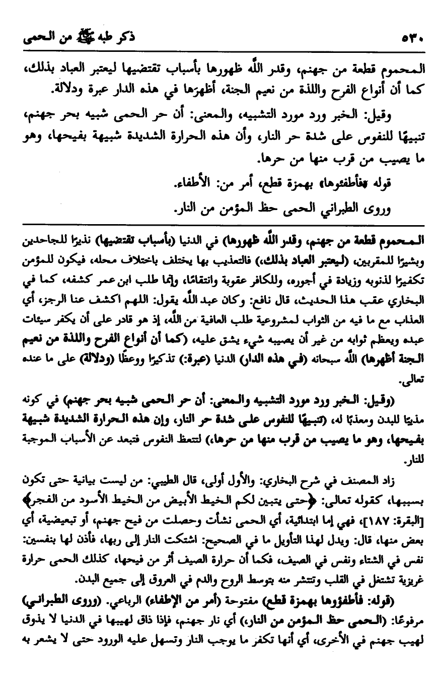 وقيل: الخبر ورد مورد التشبيه، والمعنى: أن حر الحمى شبيه بحر جهنم، تنبيهًا للنفوس على شدة حر النار، وأن هذه الحرارة الشديدة شبيهة بفيحها، وهو ما يصيب من قرب منها من حرها.