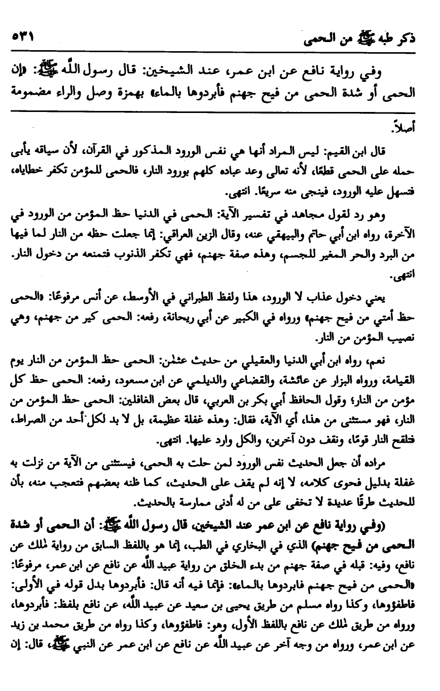 "وفي رواية نافع عن ابن عمر عند الشيخين، قال رسول الله صلى الله عليه وسلم: "إن الحمى أو شدة الحمى من فيح جهنم" الذي في البخاري في الطب، إنما هو باللفظ السابق من رواية مالك عن نافع، وفيه: قبله في صفة جهنم من بدء الخلق من رواية عبيد الله عن نافع عن ابن عمر، مرفوعًا: "الحمى من فيح جهنم فابردوها بالماء": فإنما فيه أنه قال: فأبردوها بدل قوله في الأولى: فأطفئوها، وكذا رواه مسلم من طريق يحيى بن سعيد عن عبيد الله، عن نافع بلفظ: فأبردوها، ورواه من طريق مالك عن نافع باللفظ الأول، وهو: فأطفئوها، وكذا رواه من طريق محمد بن زيد عن ابن عمر، ورواه من وجه آخر عن عبيد الله عن نافع عن ابن عمر عن النبي صلى الله عليه وسلم، قال: "إن