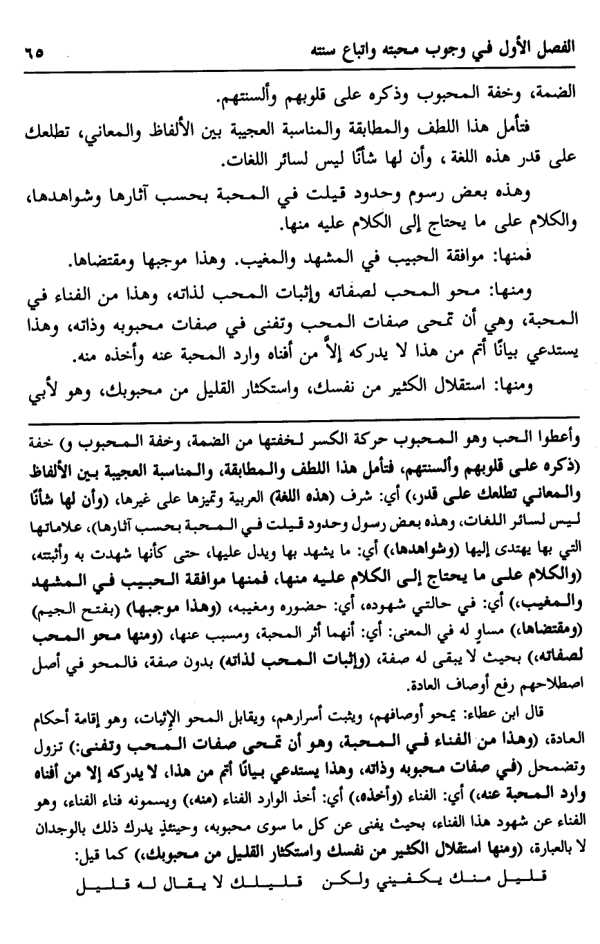 وأعطوا الحب وهو المحبوب حركة الكسر لخفتها من الضمة، وخفة المحبوب و" خفة "ذكره على قلوبهم وألسنتهم فتأمل هذا اللطف والمطابقة، والمناسبة العجيبة بين الألفاظ والمعاني تطلعك على قدر" أي: شرف "هذه اللغة" العربية وتميزها على غيرها "وأن لها شأنًا ليس لسائر اللغات، وهذه بعض رسول وحدود قيلت في المحبة بحسب آثارها"، علاماتها التي بها يهتدي إليها "وشواهدها" أي: ما يشهد بها ويدل عليها، حتى كأنها شهدت به وأثبتته، "والكلام على ما يحتاج إلى الكلام عليه منها، فمنها موافقة الحبيب في المشهد والمغيب"، أي: في حالتي شهوده، أي: حضوره ومغيبة، "وهذا موجبها" "بفتح الجيم" "ومقتضاها" مساوٍ له في المعنى: أي: أنهما أثر المحبة، ومسبب عنها، "ومنها محو المحب لصفاته" بحيث لا يبقى له صفة، "وإثبات المحب لذاته" بدون صفة، فالمحو في أصل اطصلاحهم رفع أوصاف العادة.