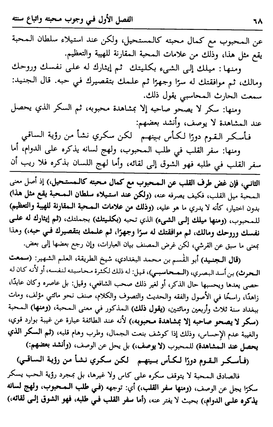 قال الجنيد: أبو القاسم بن محمد البغدادي شيخ الطريقة، العلم الشهير: "سمعت الحرث" بن أسد البصري، "المحاسبي" قيل: له ذلك لكثرة محاسبته لنفسه، أو لأنه كان له حصى يعدها ويحسبها حال الذكر، أو لغير ذلك صحب الشافعي، وقيل: بل عاصره وكان عابدًا، زاهدًا، راسخًا في الأصول والفقه والحديث والتصوف والكلام، صنف نحو مائتي مؤلف، ومات ببغداد سنة ثلاث وأربعين ومائتين، "يقول ذلك" المذكور في معنى المحبة "ومنها" المحبة "سكر لا يصحو صاحبه إلا بمشاهدة محبوبه" لأنه عند الطائفة عبارة عن غيبة بوارد قوي، والغيبة عدم الإحساس، وذلك إذا كوشف بنعت الجمال, وطرب وهام قلبه، "ثم السكر الذي يحصل عند المشاهدة" للمحبوب "لا يوصف" بل يحل عن الوصف "وأنشد بعضهم"