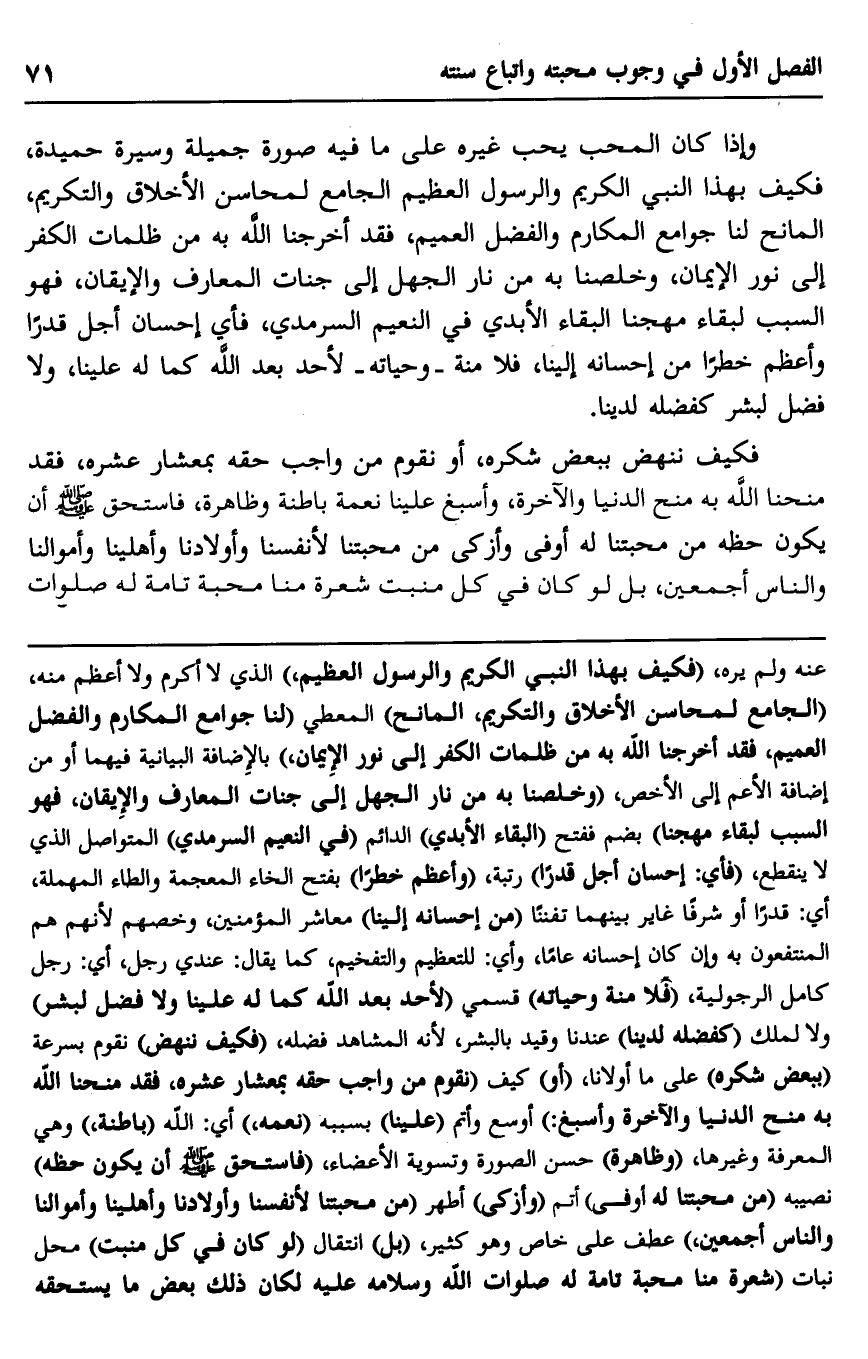 وإذا كان المحب يحب غيره على ما فيه صورة جميلة وسيرة حميدة، فكيف بهذا النبي الكريم والرسول العظيم الجامع لمحاسن الأخلاق والتكريم، المانح لنا جوامع المكارم والفضل العميم، فقد أخرجنا الله به من ظلمات الكفر إلى نور الإيمان، وخلصنا به من نار الجهل إلى جنات المعارف والإيقان، فهو السبب لبقاء مهجنا البقاء الأبدي في النعيم السرمدي، فأي إحسان أجل قدرًا وأعظم خطرًا من إحسانه إلينا، فلا منة -وحياته- لأحد بعد الله كما له علينا، ولا فضل لبشر كفضله لدينا.