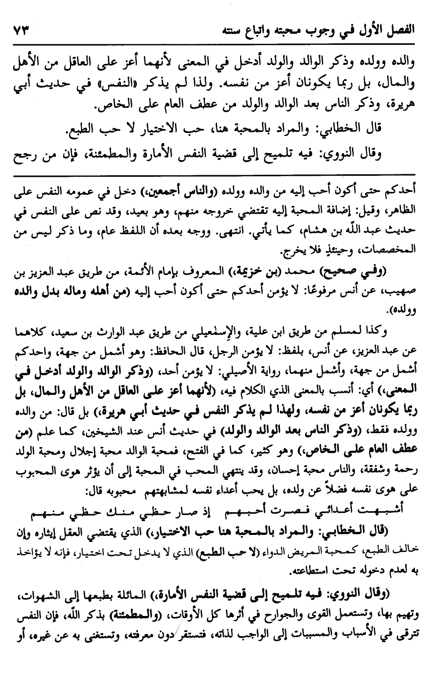 "وفي صحيح" محمد "بن خزيمة" المعروف بإمام الأئمة، من طريق عبد العزيز بن صهيب، عن أنس مرفوعًا: "لا يؤمن أحدكم حتى أكون أحب إليه من أهله وماله" بدل والده وولده.