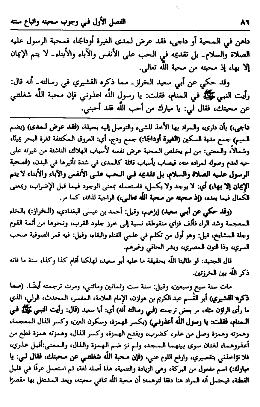 وقد حكي عن أبي سعيد الخراز -مما ذكره القشيري في رسالته- أنه قال: رأيت النبي صلى الله عليه وسلم في المنام، فقلت: يا رسول الله أعذرني فإن محبة الله شغلتني عن محبتك، فقال لي: يا مبارك من أحب الله فقد أحبني.