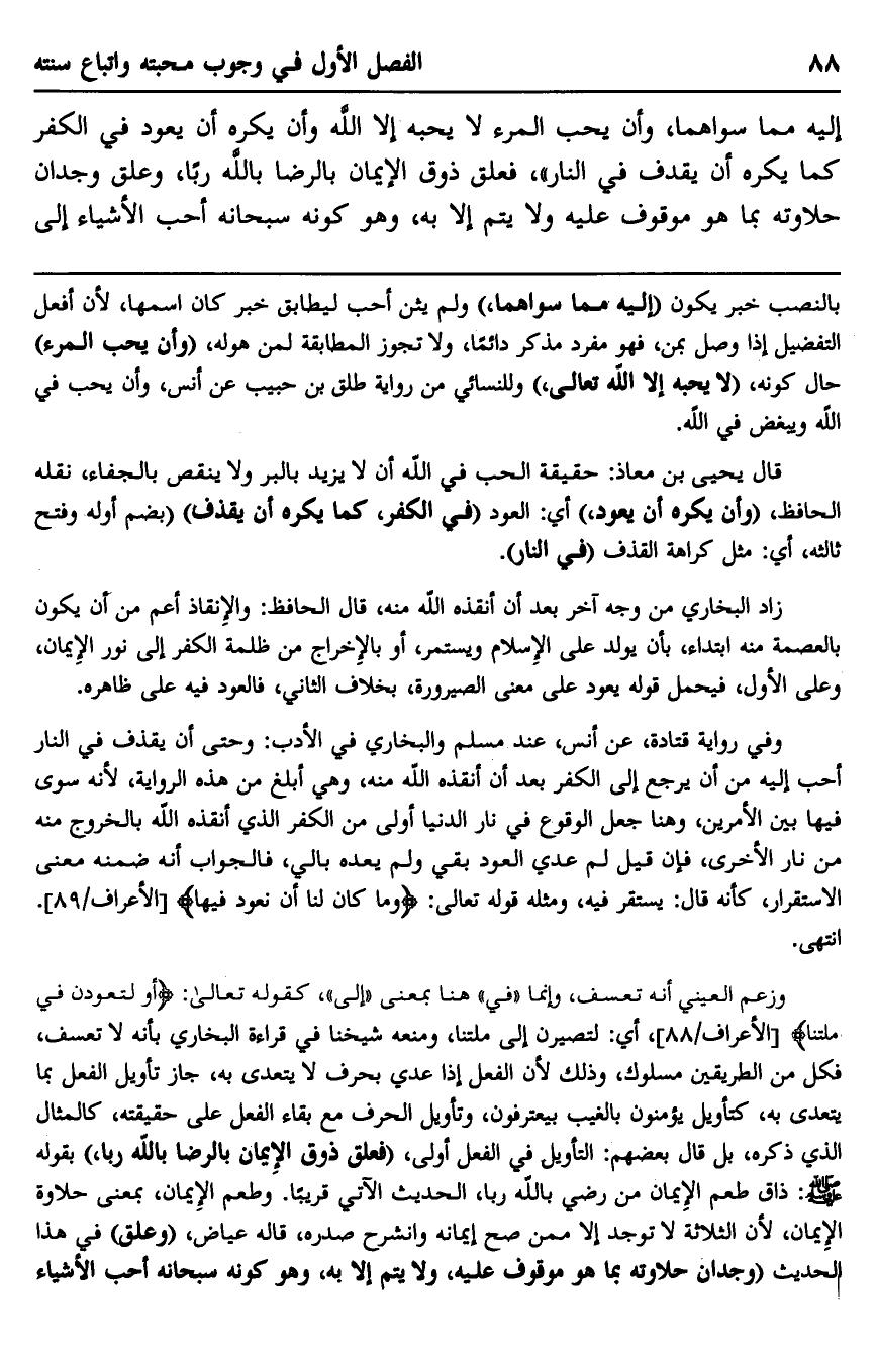 إليه مما سواهما، وأن يحب المرء لا يحبه إلا الله وأن يكره أن يعود في الكفر كما يكره أن يقذف في النار"، فعلق ذوق الإيمان بالرضا بالله ربًَّا، وعلق وجدان حلاوته بما هو موقوف عليه، ولا يتم إلا به، وهوكونه سبحانه أحب الأشياء إلى