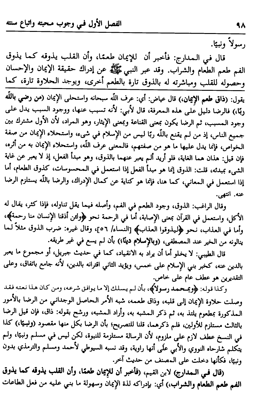 "قال في المدارج" لابن القيم "فأخبر أن للإيمان طعمًا، وأن القلب يذوقه كما يذوق الفم طعم الطعام والشراب"، أي: بإدراكه لذة الإيمان وسهولة ما بني عليه من فعل الطاعات