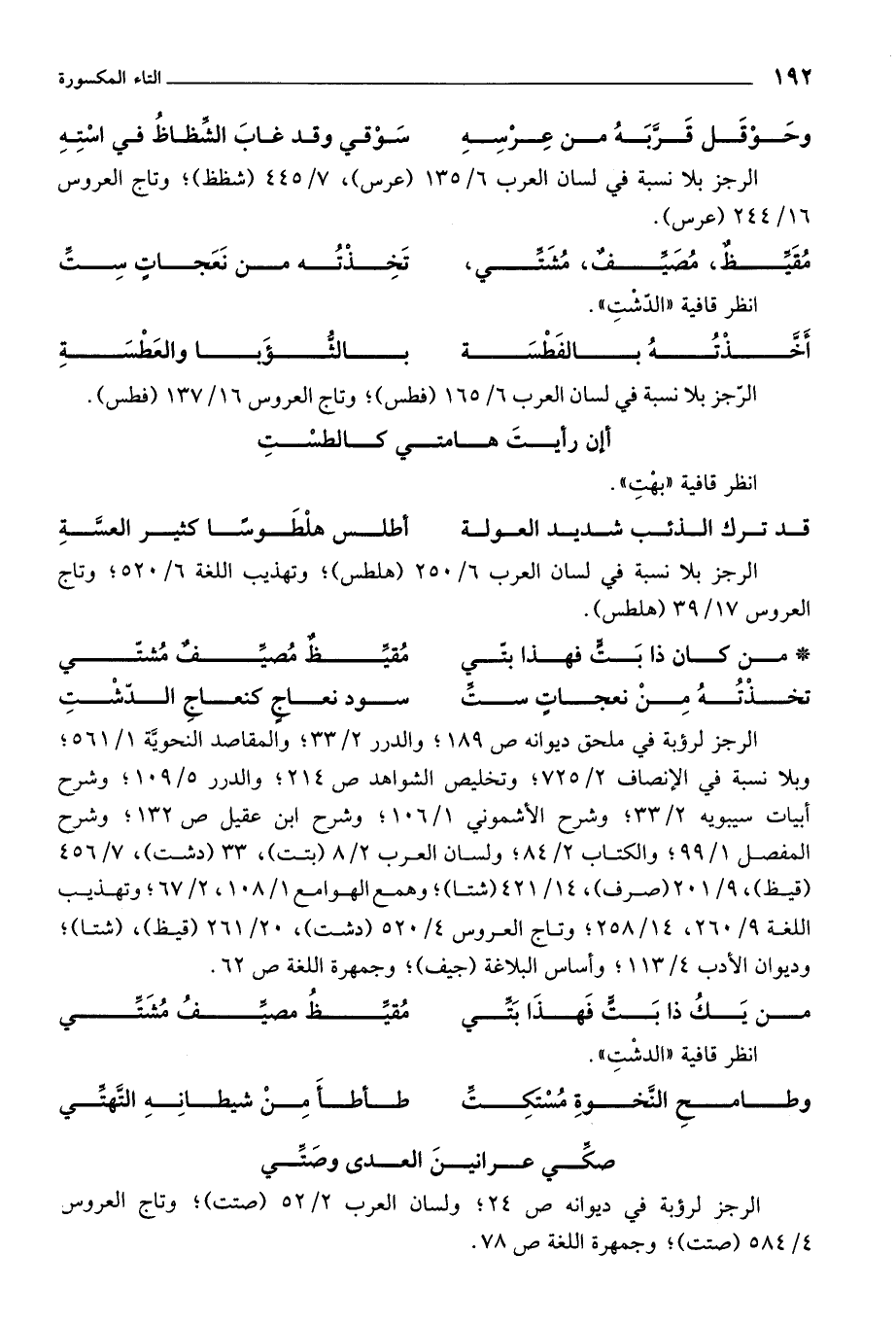 الرجز لرؤبة في ملحق ديوانه ص 189؛ والدرر 2/ 33؛ والمقاصد النحوية 1/ 561؛ وبلا نسبة في الإنصاف 2/ 725؛ وتخليص الشواهد ص 214؛ والدرر 5/ 109؛ وشرح أبيات سيبويه 2/ 33؛ وشرح الأشموني 1/ 106؛ وشرح ابن عقيل ص 132؛ وشرح المفصل 1/ 99؛ والكتاب 2/ 84؛ ولسان العرب 2/ 8 (بتت)، 33 (دشت)، 7/ 456 (قيظ)، 9/ 201 (صرف)، 14/ 421 (شتا)؛ وهمع الهوامع 1/ 108، 2/ 67؛ وتهذيب اللغة 9/ 260، 14/ 258؛ وتاج العروس 4/ 520 (دشت)، 20/ 261 (قيظ)، (شتا)؛ وديوان الأدب 4/ 113؛ وأساس البلاغة (جيف)؛ وجمهرة اللغة ص 62.
