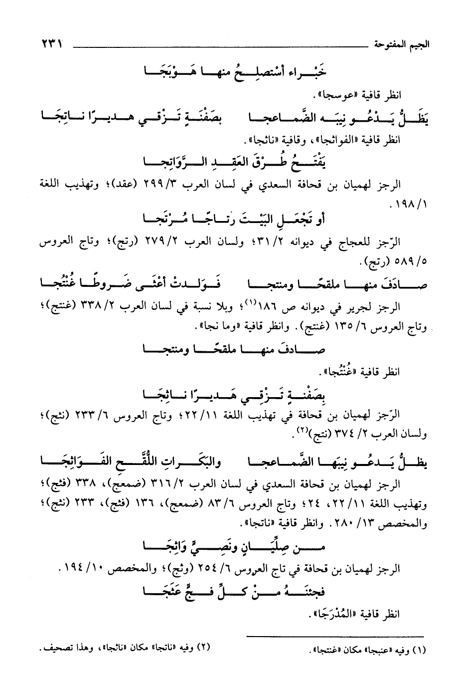 الرجز لهميان بن قحافة السعدي في لسان العرب 2/ 316 (ضمعج)، 338 (فثج)؛ وتهذيب اللغة 11/ 22، 24؛ وتاج العروس 6/ 83 (ضمعج)، 136 (فثج)، 233 (نثج)؛ والمخصص 13/ 280. وانظر قافية «ناتجا».