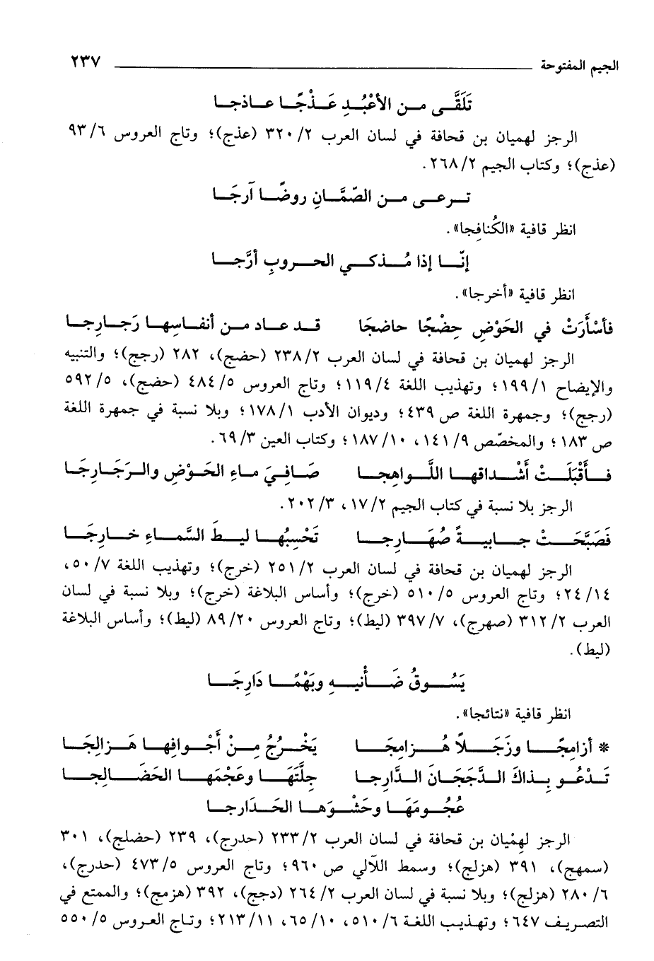 الرجز لهميان ببن قحافة في لسان العرب 2/ 233 (حدرج)، 239 (حضلج)، 301 (سمهج)، 391 (هزلج)؛ وسمط اللآلي ص 960؛ وتاج العروس 5/ 473 (نحدرج)، 6/ 280 (هزلج)؛ وبلا نسبة في لسان العرب 2/ 264 (دجج)، 392 (هزمج)؛ والممتع في التصريف 647؛ وتهذيب اللغة 6/ 510، 10/ 65، 11/ 216؛ وتاج العروس 5/ 550