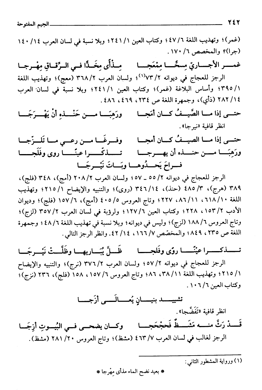الرجز للعجاج في ديوانه 2/ 55 - 57؛ ولسان العرب 2/ 208 (أمج)، 348 (فلج)، 389 (هرج)، 3/ 485 (حنذ)، 14/ 346 (روى)؛ والتنبيه والإيضاح 1/ 215؛ وتهذيب اللغة 10/ 618، 11/ 86، 227؛ وتاج العروس 5/ 405 (أمج)، 6/ 157 (فلج)؛ وديوان الأدب 2/ 153، 228؛ وكتاب العين 6/ 127؛ ولرؤبة في لسان العرب 2/ 357 (لزج)؛ وتاج العروس 6/ 188 (لزج)؛ وليس في ديوانه؛ وبلا نسبة في تهذيب اللغة 6/ 48؛ وجمهرة اللغة ص 235، 849؛ والمخصص 7/ 166، 14/ 42. وانظر الرجز التالي.