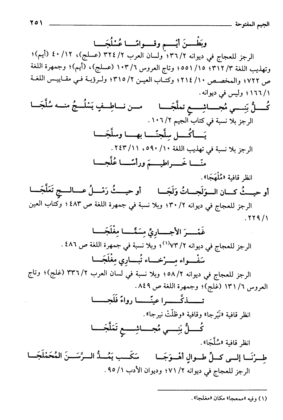 الرجز للعجاج في ديوانه 2/ 36؛ ولسان العرب 2/ 324 (عسلج)، 12/ 40 (أيم)؛ وتهذيب اللغة 3/ 312؛ 15/ 551؛ وتاج العروس 6/ 103 (عسلج)، (أيم)؛ وجمهرة اللغة ص 722؛ والمخصص 10/ 214؛ وكتاب العين 2/ 315؛ ولرؤبة في مقاييس اللغة 1/ 166؛ وليس في ديوانه.