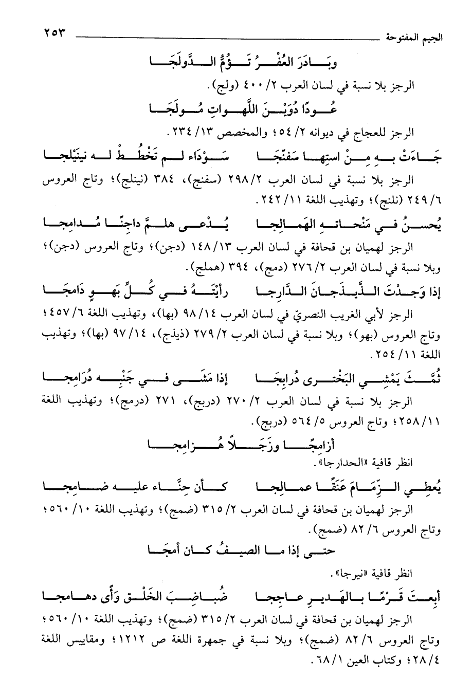 الرجز لهميان بن قحافة في لسان العرب 13/ 148 (دجن)؛ وتاج العروس (دجن)؛ وبلا نسبة في لسان العرب 2/ 276 (دمج)، 394 (هملج).