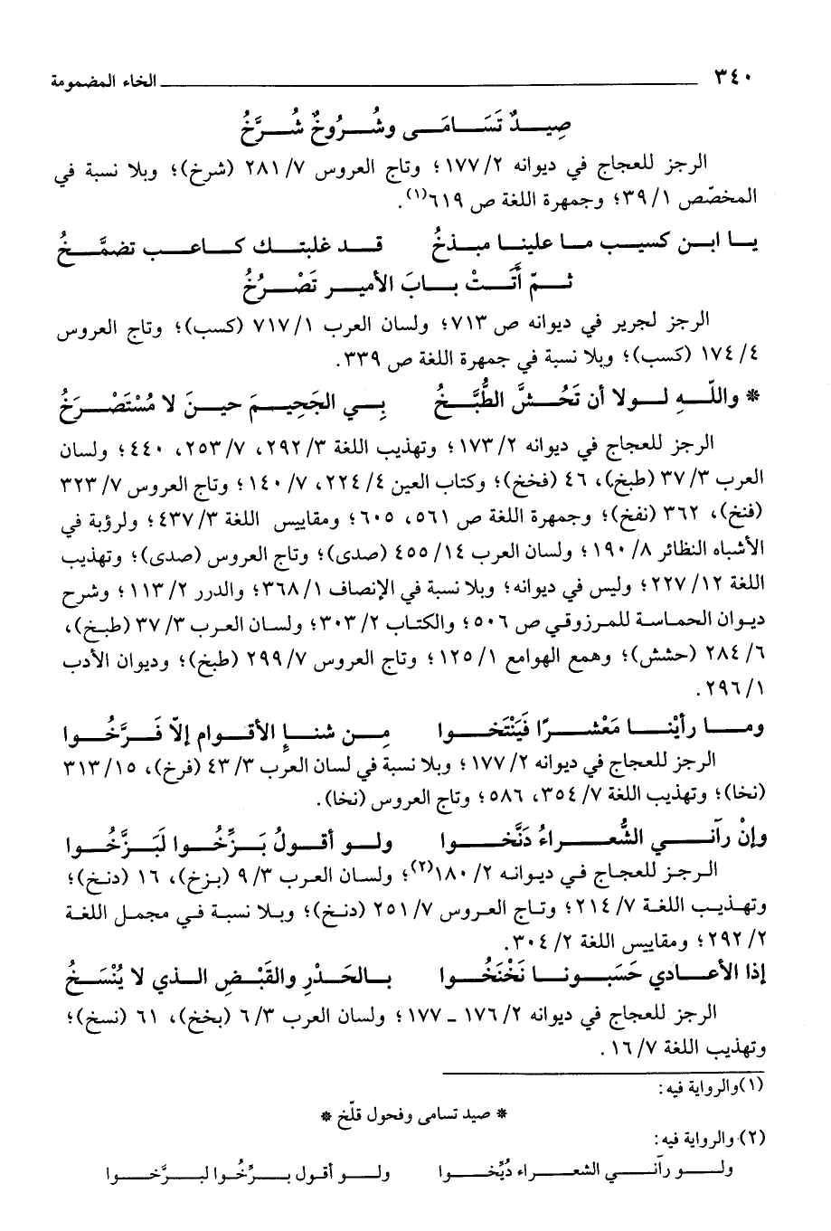 الرجز للعجاج في ديوانه 2/ 173؛ وتهذيب اللغة 3/ 292، 7/ 253، 440؛ ولسان العرب 3/ 37 (طبخ)، 46 (فخخ)؛ وكتاب العين 4/ 224، 7/ 140؛ وتاج العروس 7/ 323 (فنخ)، 362 (نفخ)؛ وجمهرة اللغة ص 561، 605؛ ومقاييس اللغة 3/ 437؛ ولرؤبة في الأشباه النظائر 8/ 190؛ ولسان العرب 14/ 455 (صدى)؛ وتاج العروس (صدى)؛ وتهذيب اللغة 12/ 227؛ وليس في ديوانه؛ وبلا نسبة في الإنصاف 1/ 368؛ والدرر 2/ 113؛ وشرح ديوان الحماسة للمرزوقي ص 506؛ والكتاب 2/ 303؛ ولسان العرب 3/ 37 (طبخ)، 6/ 284 (حشش)؛ وهمع الهوامع 1/ 125؛ وتاج العروس 7/ 299 (طبخ)؛ وديوان الأدب 1/ 296.