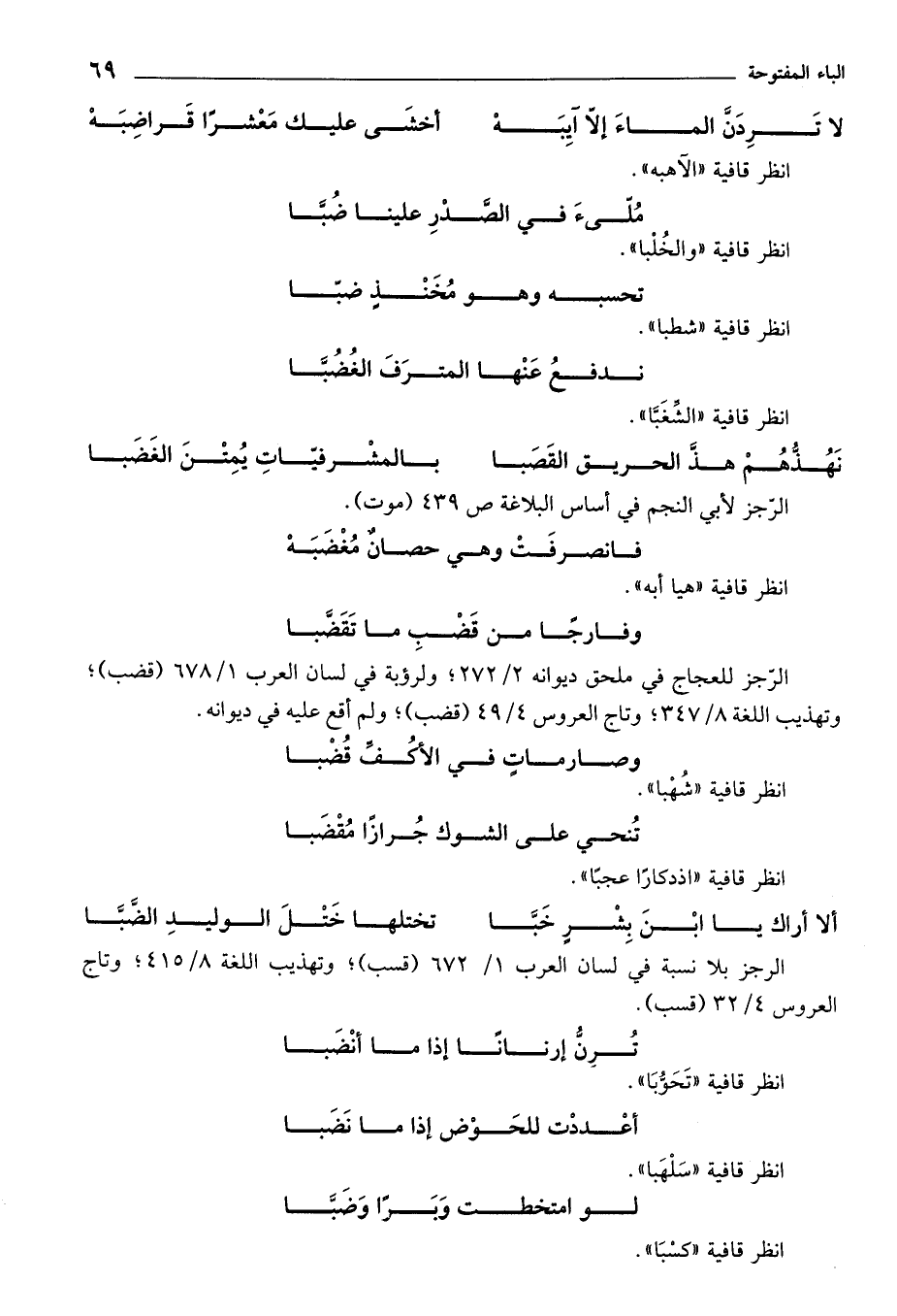 الرجز للعجاج في ملحق ديوانه 2/ 272؛ ولرؤبة في لسان العرب 1/ 678 (قضب)؛ وتهذيب اللغة 8/ 347؛ وتاج العروس 4/ 49 (قضب)؛ ولم أقع عليه في ديوانه.