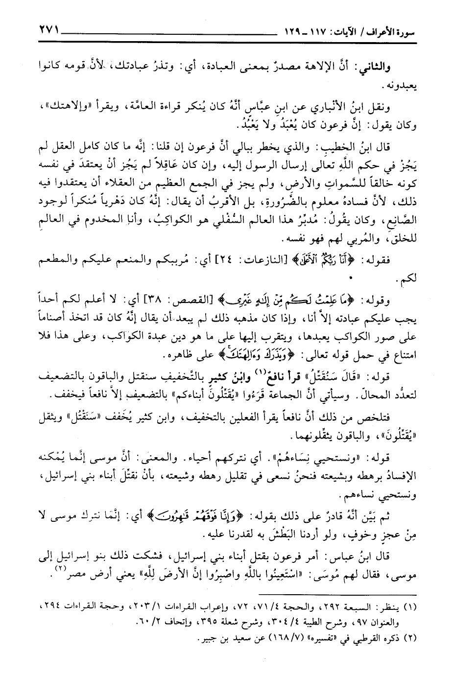 ونقل ابنُ الأنْباري عن ابن عبَّاسٍ أنَّهُ كان يُنكر قراءة العامَّة، ويقرأ «وإلاهتك» ، وكان يقول: إنَّ فرعون كان يُعْبَدُ ولا يَعْبُدُ.