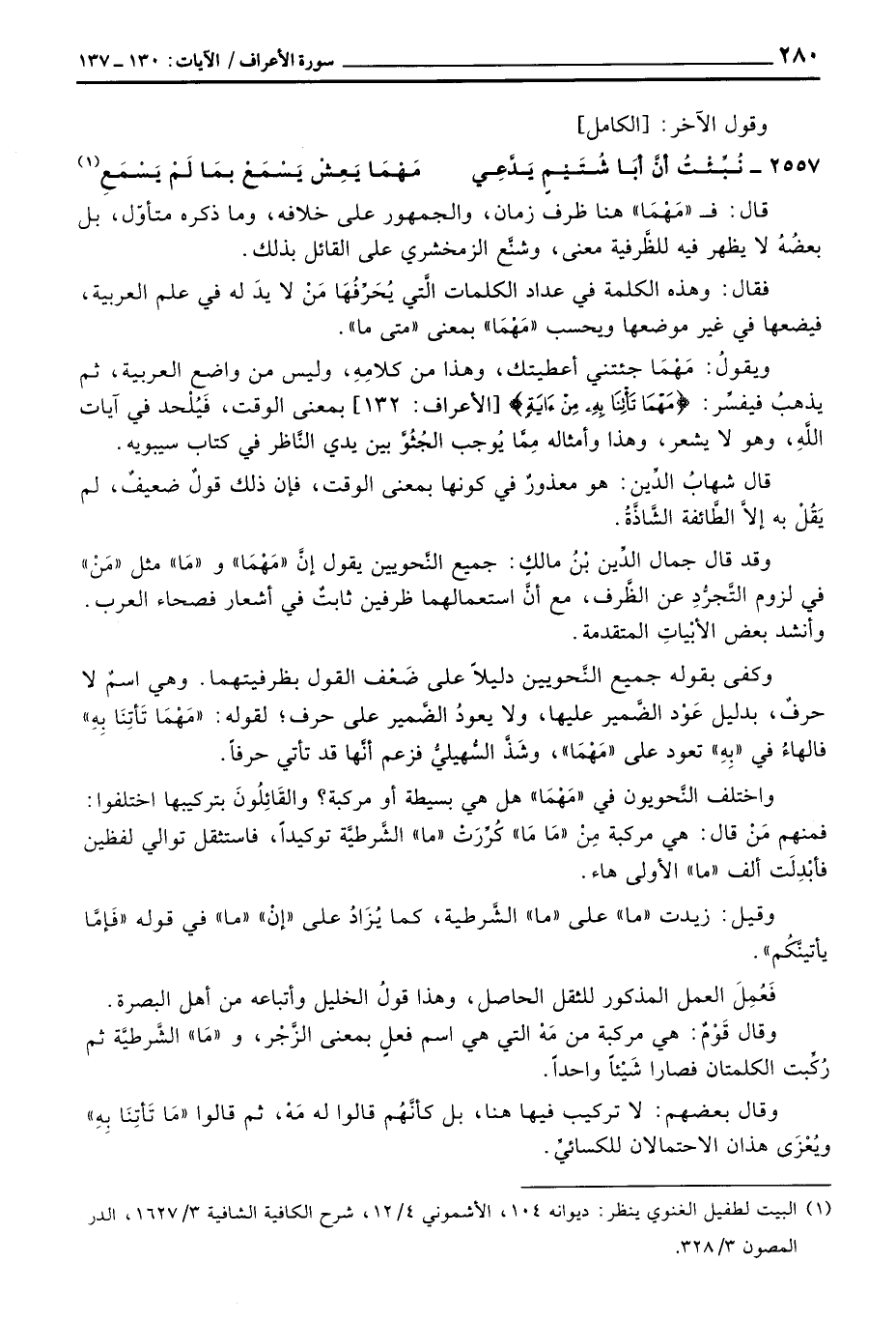 ويقولُ: مَهْمَا جئتني أعطيتك، وهذا من كلامِهِ، وليس من واضع العربية، ثم يذهبُ فيفسِّر: {مَهْمَا تَأْتِنَا بِهِ مِن آيَةٍ} [الأعراف: 132] بمعنى الوقت، فَيُلْحد في آيات اللَّهِ، وهو لا يشعر، وهذا وأمثاله مِمَّا يُوجب الجُثُوَّ بين يدي النَّاظر في كتاب سيبويه.