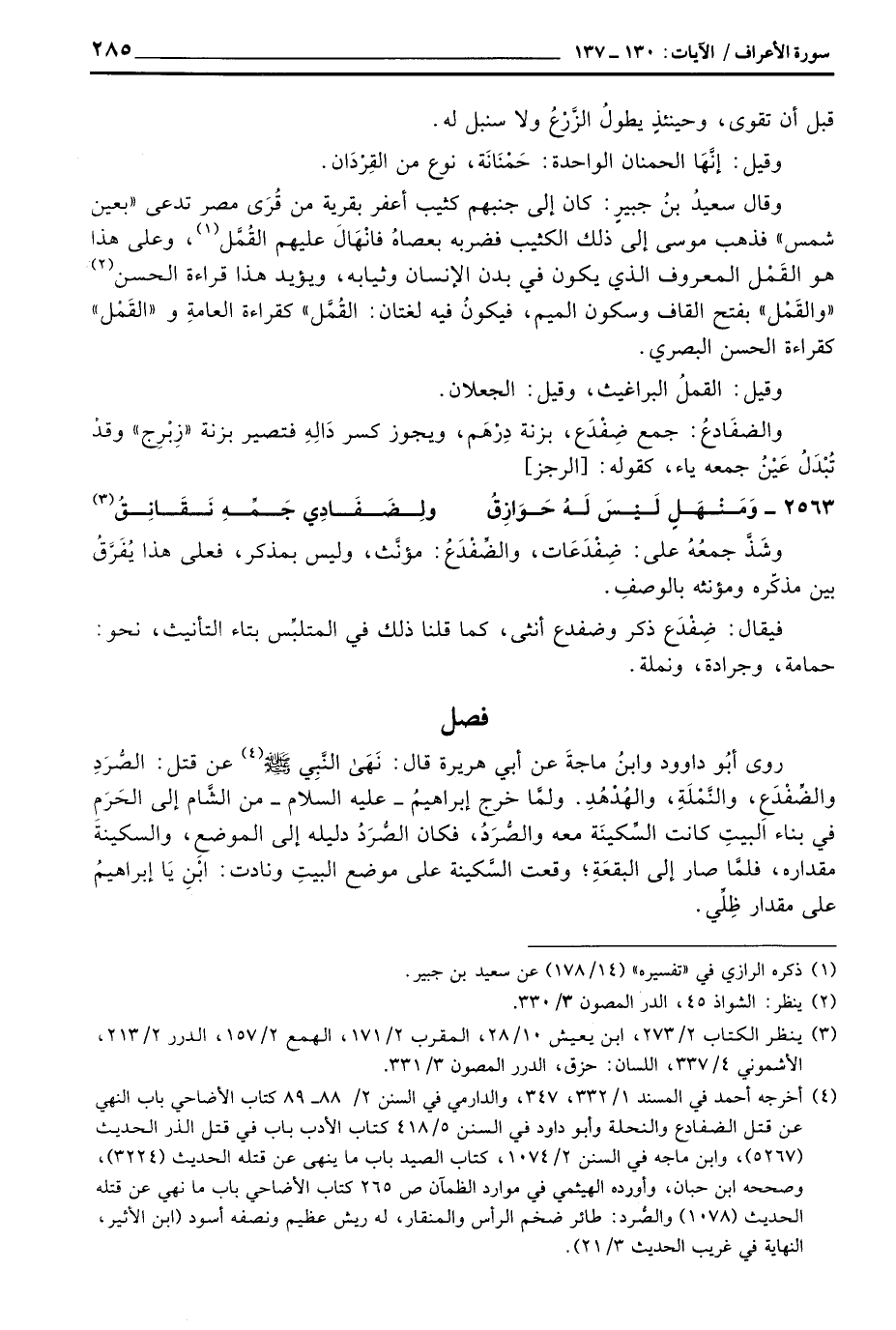 وقال سعيدُ بنُ جبيرٍ: كان إلى جنبهم كثيب أعفر بقرية من قُرَى مصر تدعى «بعين شمس» فذهب موسى إلى ذلك الكثيب فضربه بعصاهُ فانْهَالَ عليهم القُمَّل، وعلى هذا هو القَمْل المعروف الذي يكون في بدن الإنسان وثيابه، ويؤيد هذا قراءة الحسن «والقَمْل» بفتح القاف وسكون الميم، فيكونُ فيه لغتان: القُمَّل «كقراءة العامةِ و» القَمْل «كقراءة الحسن البصري.