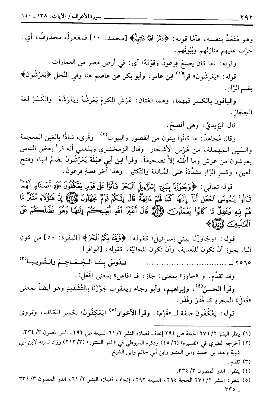 وقال مُجاهدٌ: ما كانُوا يبنون من القصور والبيوت. وقُرئ شاذّاً بالغين المعجمةِ والسِّين المهملة، من غَرْس الأشجَار. وقال الزمخشري وبلغني أنه قرأ بعض الناس يعرشون من عرش وما أظُنّه إلاّ تصحيفاً. وقرأ ابن أبي عبْلَةَ يُعَرِّشُونَ بضمِّ الياء وفتحِ العين، وكسرِ الرَّاءِ مشدَّدَةً على المُبالغة والتَّكثير. وهذا آخر قصةِ فرعونَ.