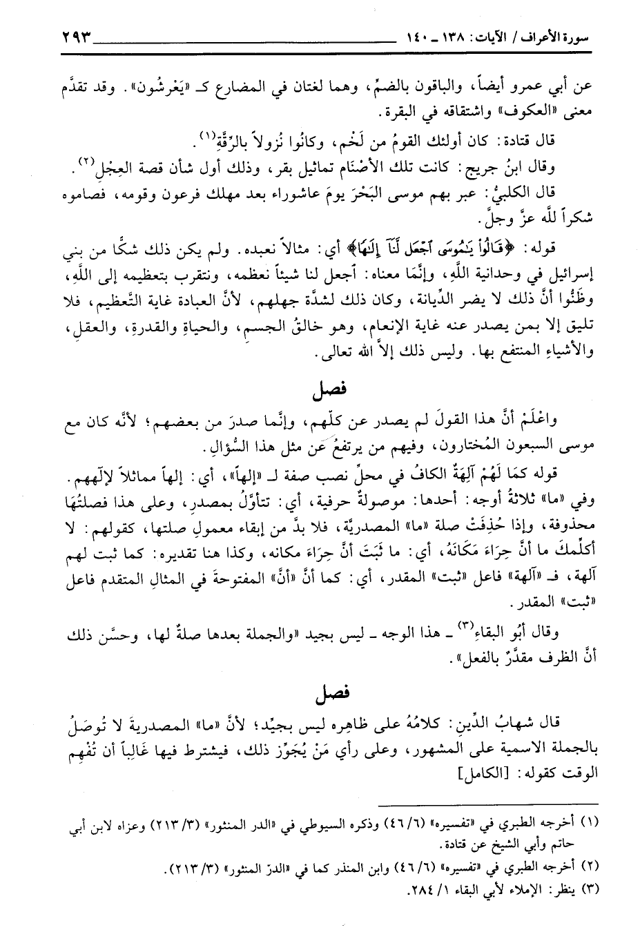 وفي «ما» ثلاثةُ أوجه: أحدها: موصولةٌ حرفية، أي: تتأوَّلُ بمصدرِ، وعلى هذا فصلتُهَا محذوفة، وإذا حُذِفَتْ صلة «ما» المصدريَّة، فلا بدَّ من إبقاء معمولِ صلتها، كقولهم: لا أكلِّمكَ ما أنَّ حِرَاءَ مَكَانَهُ، أي: ما ثَبَتَ أنَّ حِرَاءَ مكانه، وكذا هنا تقديره: كما ثبت لهم آلهة، ف «آلهة» فاعل «ثبت» المقدر، أي: كما أنَّ «أنَّ» المفتوحةَ في المثالِ المتقدم فاعل «ثبت» المقدر.