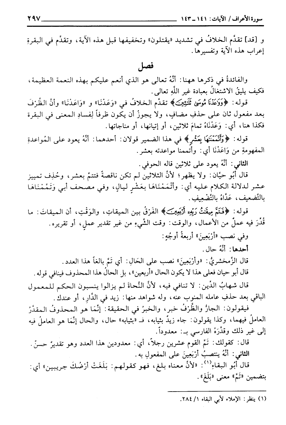 قوله: {وَأَتْمَمْنَاهَا بِعَشْرٍ} في هذا الضمير قولان: أحدهما: أنَّهُ يعود على المُواعدةِ المفهومةِ من وَاعَدْنَا أي: وأتممنا مواعدته بعشر.