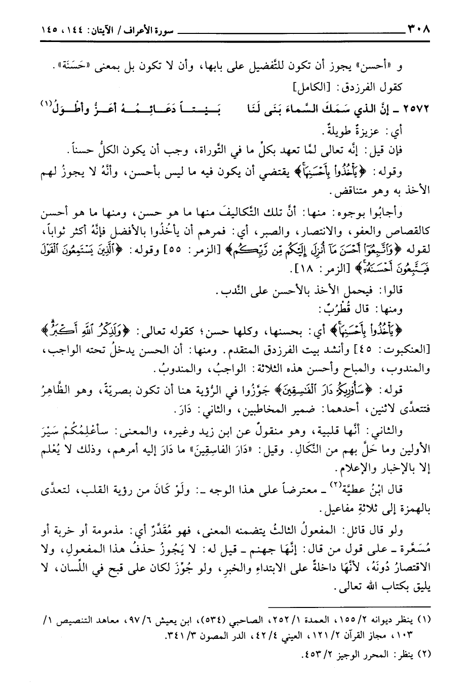 {يَأْخُذُواْ بِأَحْسَنِهَا} أي: بحسنها، وكلها حسن؛ كقوله تعالى: {وَلَذِكْرُ الله أَكْبَرُ} [العنكبوت: 45] وأنشد بيت الفرزدق المتقدم. ومنها: أن الحسن يدخلُ تحته الواجب، والمندوب، والمباح وأحسن هذه الثلاثة: الواجبُ، والمندوبُ.