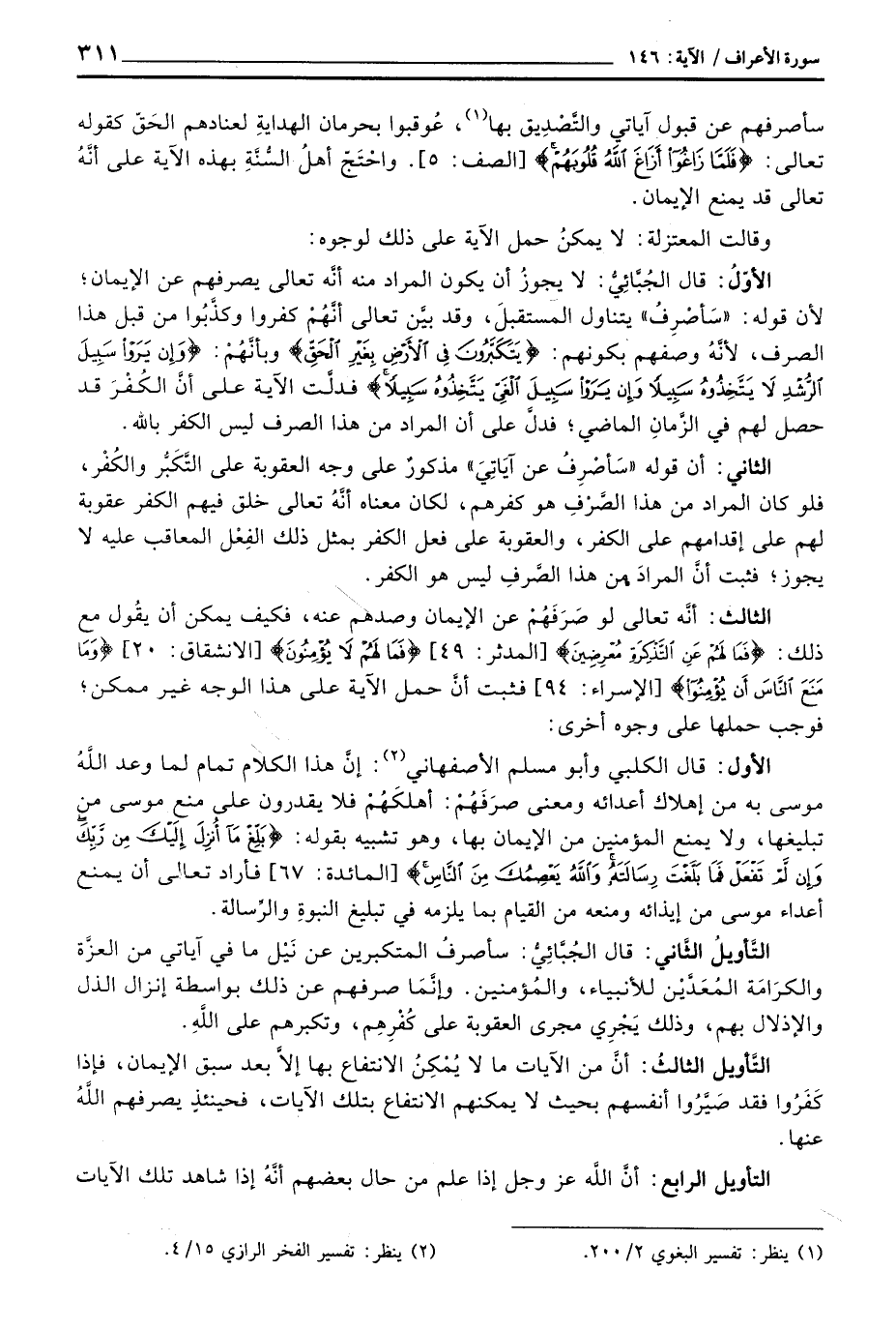 الثاني: أن قوله {سَأَصْرِفُ عَنْ آيَاتِي} مذكورٌ على وجه العقوبة على التَّكَبُّر والكُفْر، فلو كان المراد من هذا الصَّرْفِ هو كفرهم، لكان معناه أنَّهُ تعالىخلق فيهم الكفر عقوبة لهم على إقدامهم على الكفر، والعقوبة على فعل الكفر بمثل ذلك الفِعْل المعاقب عليه لا يجوز؛ فثبت أنَّ المرادَ من هذا الصَّرفِ ليس هو الكفر.