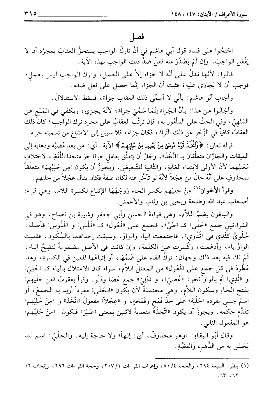والباقون بضمِّ اللاَّم، وهي قراءةُ الحسنِ وأبي جعفرٍ وشيبة بن نصاح، وهو في القراءتين جمع «حَلْيِ» ك «طَيٍّ» ، فجمع على «فُعُول» ك «فَلْس» و «فُلُوس» فأصله، حُلُويٌّ كثُدِي في «ثُدُوي» ، فاجتمعت الياء والواوُ، وسبقت إحداهما بالسُّكُون، فقلبت الواوُ ياء، وأدغمت، وكُسرت عين الكلمة، وإن كانت في الأصل مضمومةً لتصِحَّ الياء، ثُمَّ لك فيه بعد ذلك وجهانِ: تركُ الفاءِ على ضَمِّهَا، أو إتباعُها للعين في الكسرةِ، وهذا مُطَّردٌ في كل جمعٍ على «فُعُول» من المعتلِّ اللاَّم، سواء كان الاعتلال بالياء ك «حُلِيّ» و «ثُدِي» أم بالواو نحو: «عُصِيّ» ، و «دُلِيّ» جمع عَصَا ودَلْو. وقرأ يعقوبُ «من حَلِيِّهم» بفتح الحاءِ وسكون اللاَّمِ، وهي محتملةٌ لأن يكون «الحَلْي» مفرداً أريد به الجمعُ، أو اسمُ جنسٍ مفرده «حَلْيَة» على حدِّ قَمْحٍ وقَمْحَةٍ، و «عِجْلاً» مفعولُ «اتَّخَذَ» و «مِنْ حُلِيِّهم» تقدَّم حكمه. ويجوزُ أن يكون «اتَّخذَ» متعديةً لاثنين بمعنى «صَيَّرَ» فيكون: «مِنْ حُلِيِّهم» هو المفعول الثاني.