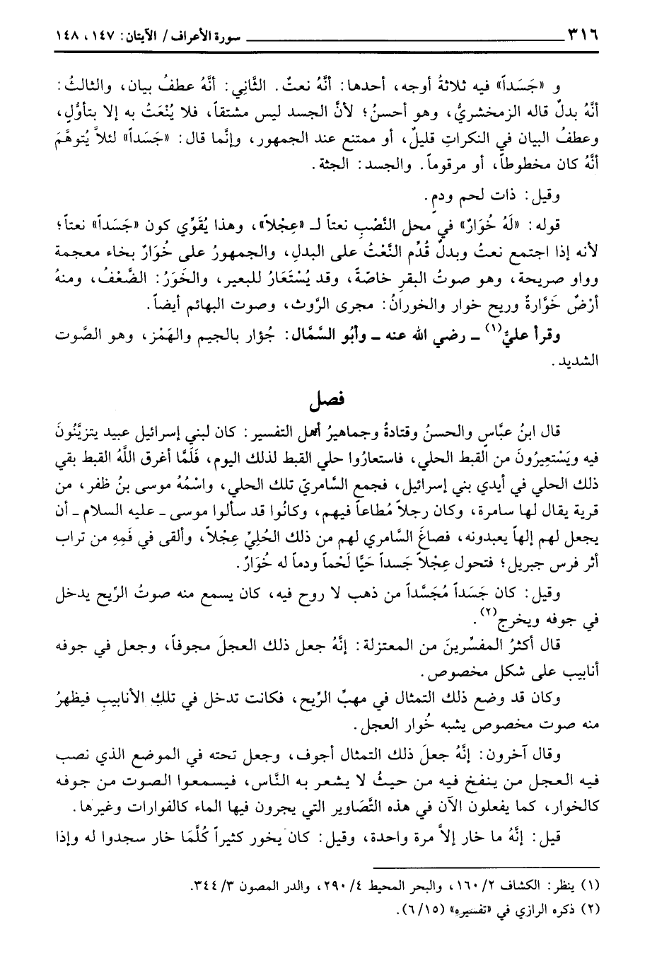 وقال آخرون: إنَّهُ جعلَ ذلك التمثال أجوف، وجعل تحته في الموضع الذي نصب فيه العجل من ينفخ فيه من حيثُ لا يشعر به النَّاس، فيسمعوا الصوت من جوفه كالخوار، كما يفعلون الآن في هذه التَّصَاوير التي يجرون فيها الماء كالفوارات وغيرها.