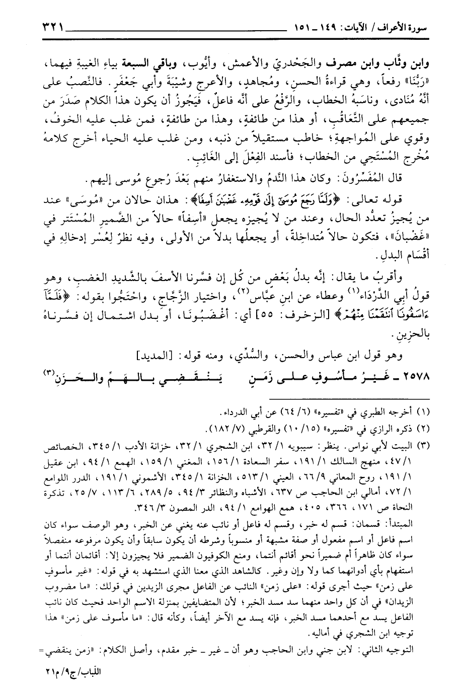 قوله تعالى: {وَلَمَّا رَجَعَ موسى إلى قَوْمِهِ غَضْبَانَ أَسِفاً} : هذان حالان من «مُوسَى» عند من يُجيزُ تعدُّد الحال، وعند من لا يُجيزه يجعل «أسِفاً» حالاً من الضَّميرِ المُسْتَتر في «غَضْبانَ» ، فتكون حالاً مُتداخِلةً، أو يجعلُها بدلاً من الأولى، وفيه نظرٌ لِعُسْر إدخالِهِ في أقْسَام البدلِ.