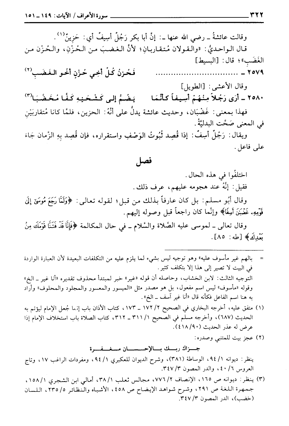 قال الواحديُّ: «والقولان مُتقاربانِ؛ لأنَّ الغضبَ من الحُزْنِ، والحُزْن من الغَضَبِ» ؛ قال: [البسيط]
