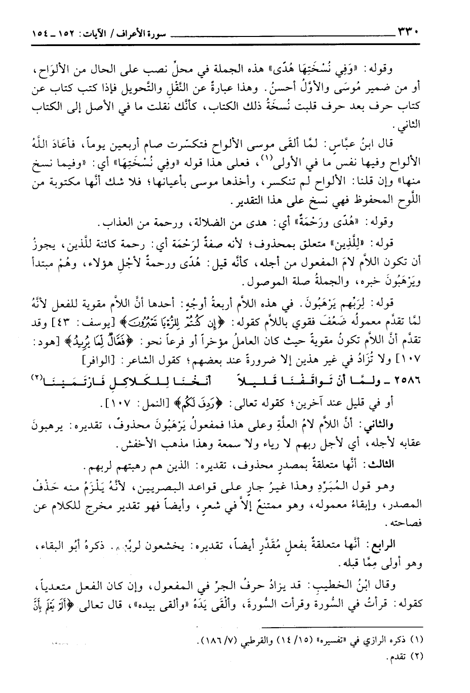 قوله: لِررَبِّهم يَرْهَبُونَ. في هذه اللاَّم أربعةُ أوجُهٍ: أحدها أنَّ اللاَّم مقوية للفعل لأنَّهُ لمَّا تقدَّم معمولُه ضَعُفَ فقوي باللاَّم كقوله: {إِن كُنتُمْ لِلرُّؤْيَا تَعْبُرُونَ} [يوسف: 43] وقد تقدَّم أنَّ اللاَّم تكونُ مقويةً حيث كان العاملُ مؤخراً أو فرعاً نحو: {فَعَّالٌ لِّمَا يُرِيدُ} [هود: 107] ولا تُزَادُ في غير هذين إلا ضرورةً عند بعضهم؛ كقول الشاعر: [الوافر]