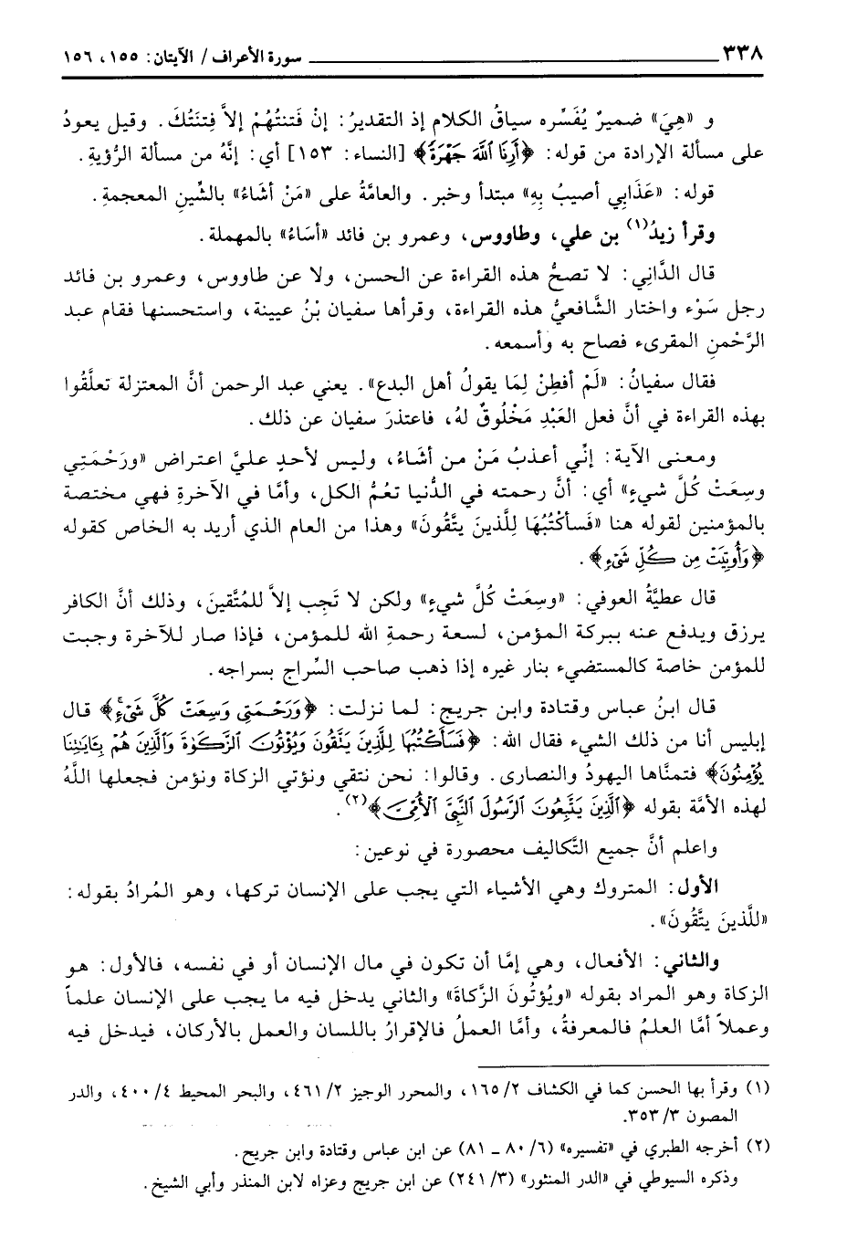 والثاني: الأفعال، وهي إمَّا أن تكون في مال الإنسان أو في نفسه، فالأول: هو الزكاة وهو المراد بقوله» ويُؤتُونَ الزَّكاةِ «والثاني يدخل فيه ما يجب على الإنسان علماً وعملاً أمَّا العلمُ فالمعرفةُ، وأمَّا العملُ فالإقرارُ باللسان والعمل بالأركان، فيدخل فيه